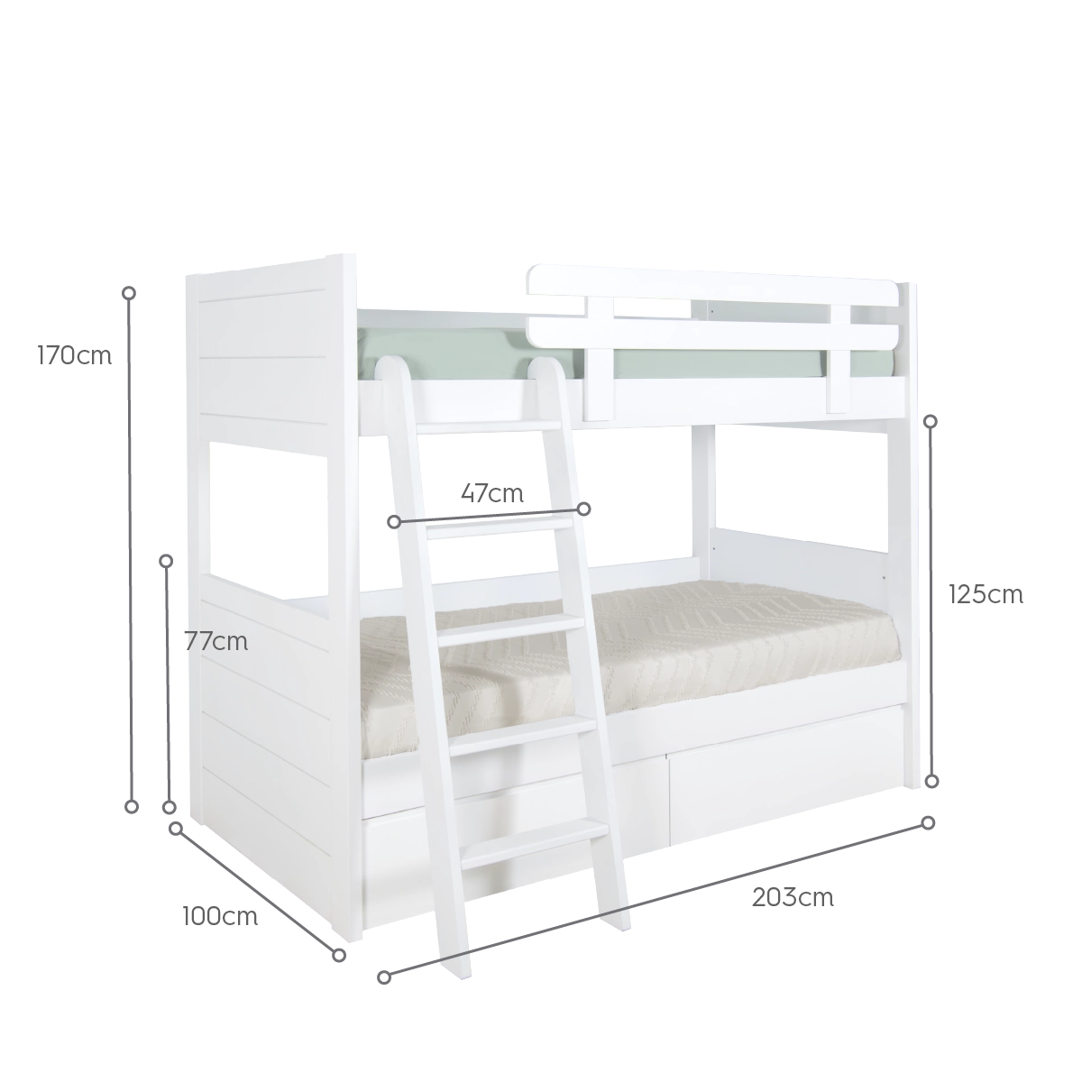 Concebido para qualquer idade, o beliche Lineal com gavetas oferece não só 2 camas, mas também 2 gavetas inferiores para arrumação extra. A estrutura leve e resistente garante um sono seguro e tranquilo, perfeito para um quarto de crianças ou jovens.