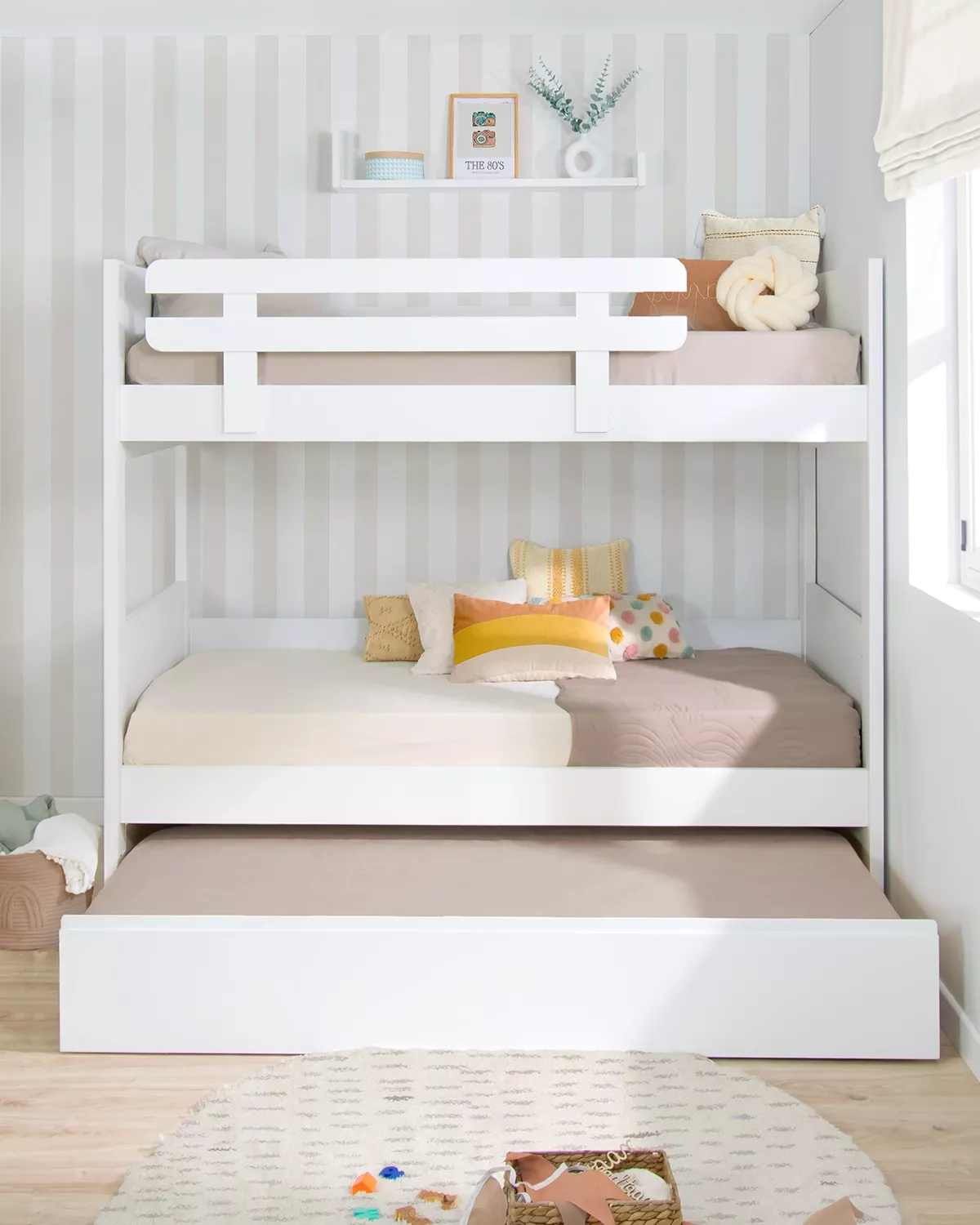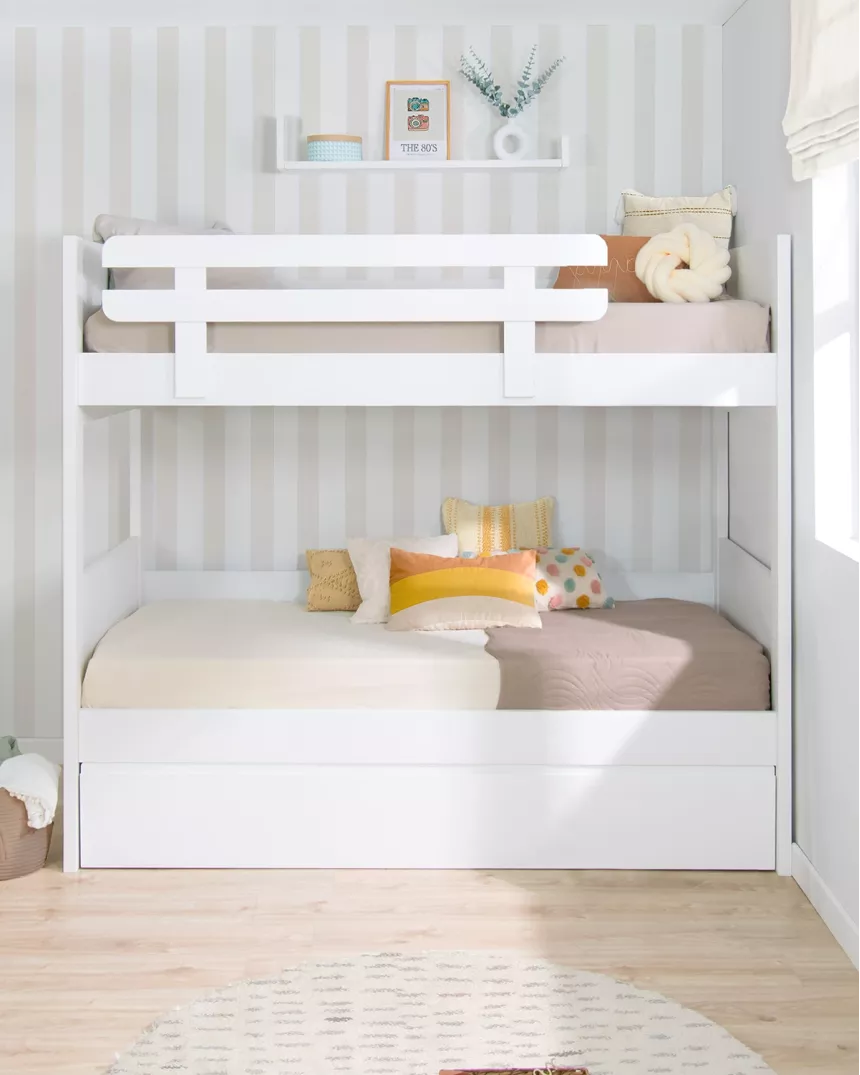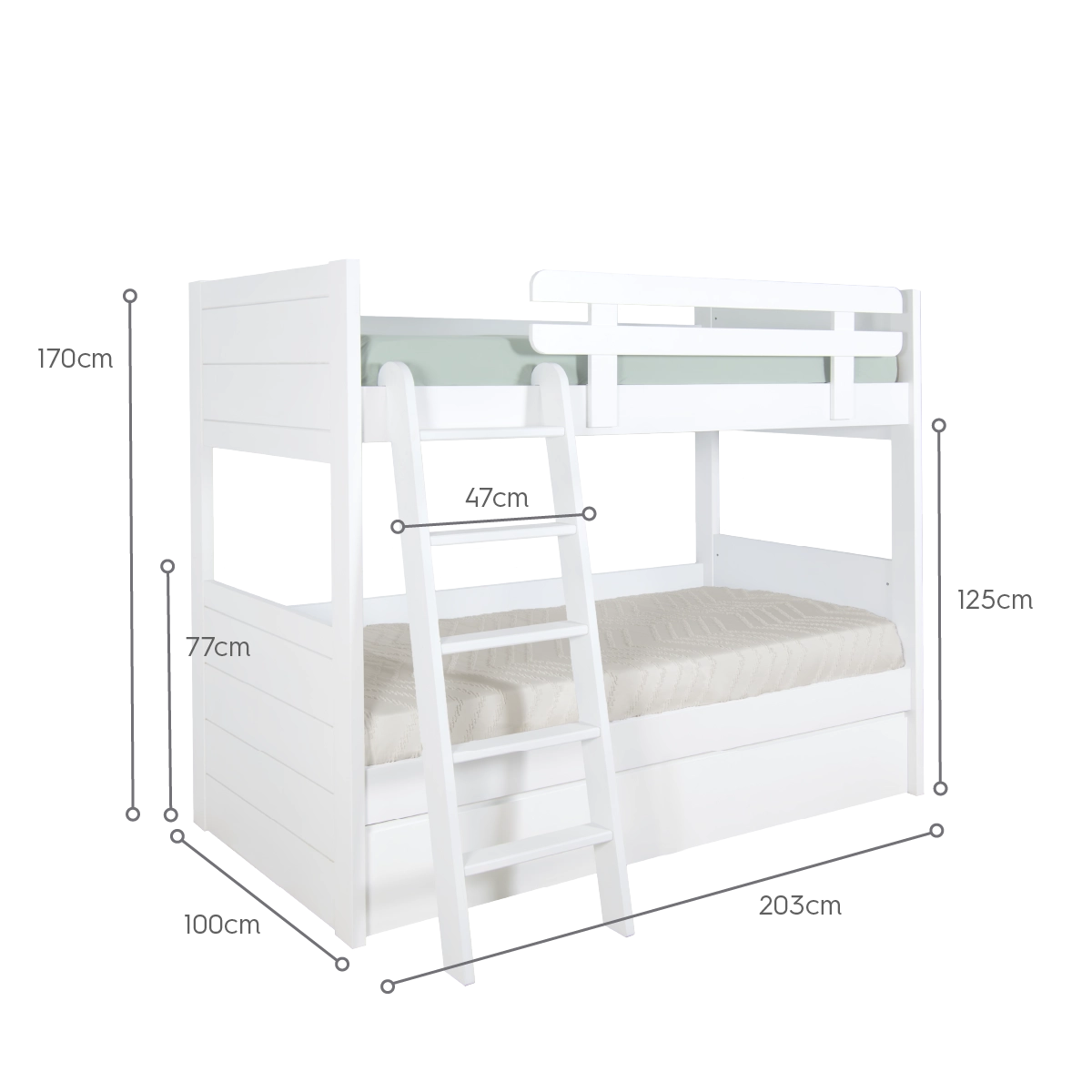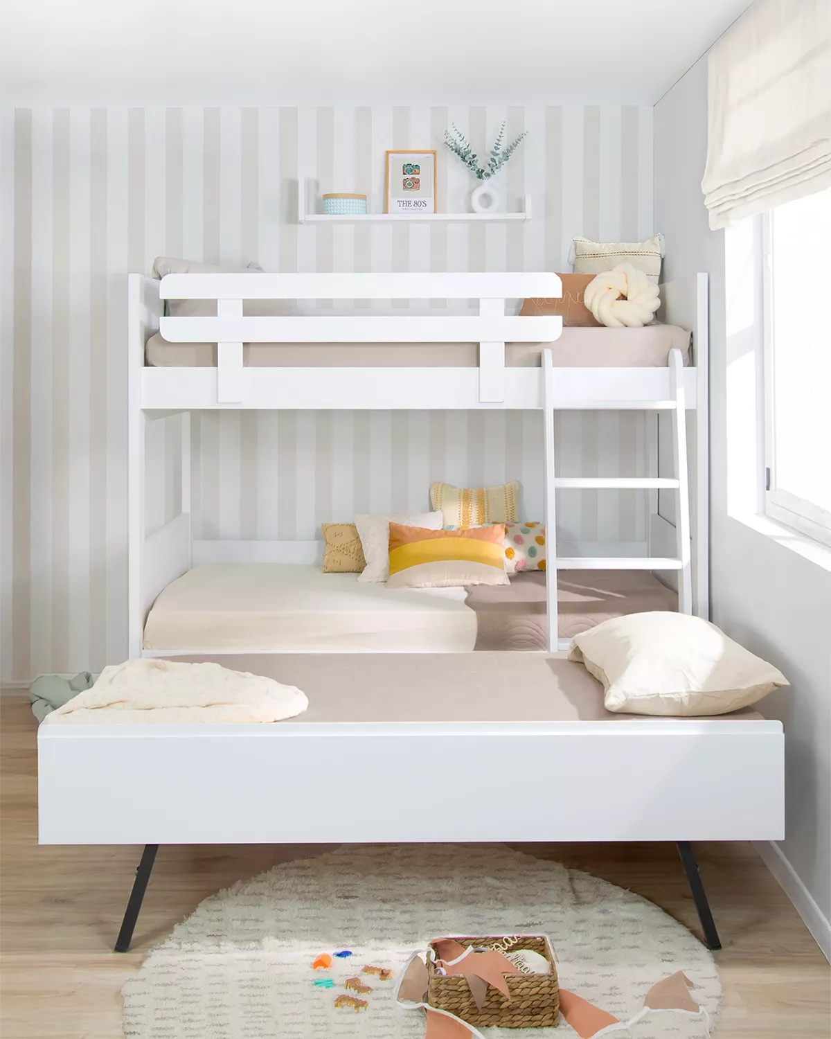 Concebido para qualquer idade, o Beliche Linear oferece não só uma cama principal confortável, mas também mais 2 camas prontas para o uso quotidiano. A estrutura leve e robusta garante um sono seguro e tranquilo, perfeito para um quarto de crianças ou jovens.