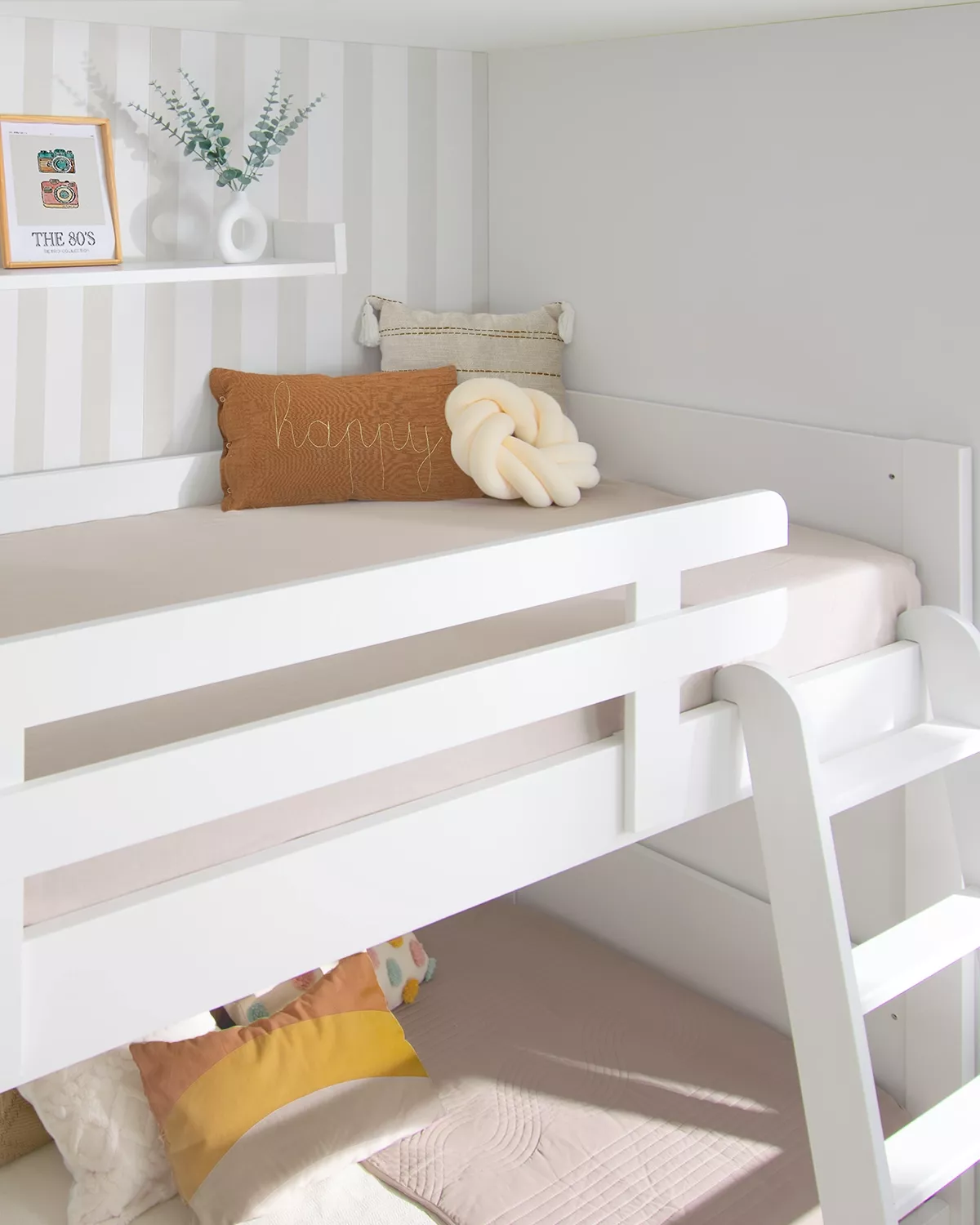 Descubra o nosso beliche LINEAR, uma solução ideal para quartos de jovens com espaço limitado. Este beliche juvenil, lacado num branco elegante, combina funcionalidade e estilo, garantindo a máxima utilização do espaço.