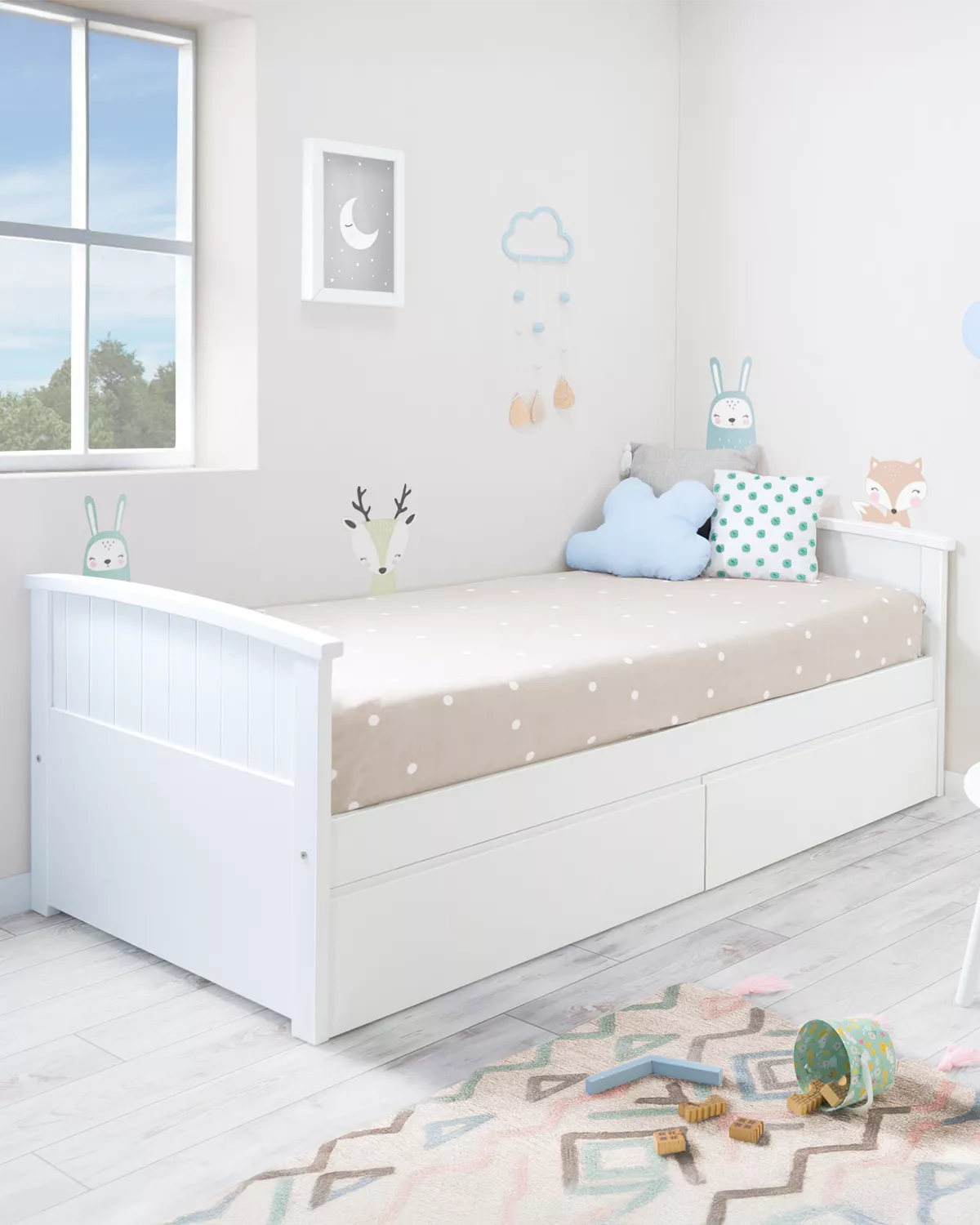 Estilo e conforto para crescer: A nossa cama com gavetas oferece uma estrutura leve mas robusta, concebida para acompanhar os seus filhos desde a infância até à idade adulta. Com uma base lacada a branco, a cama com gavetas destaca-se pelo seu calor e funcionalidade.