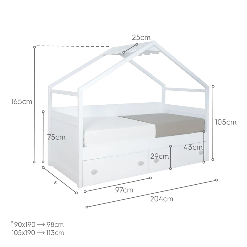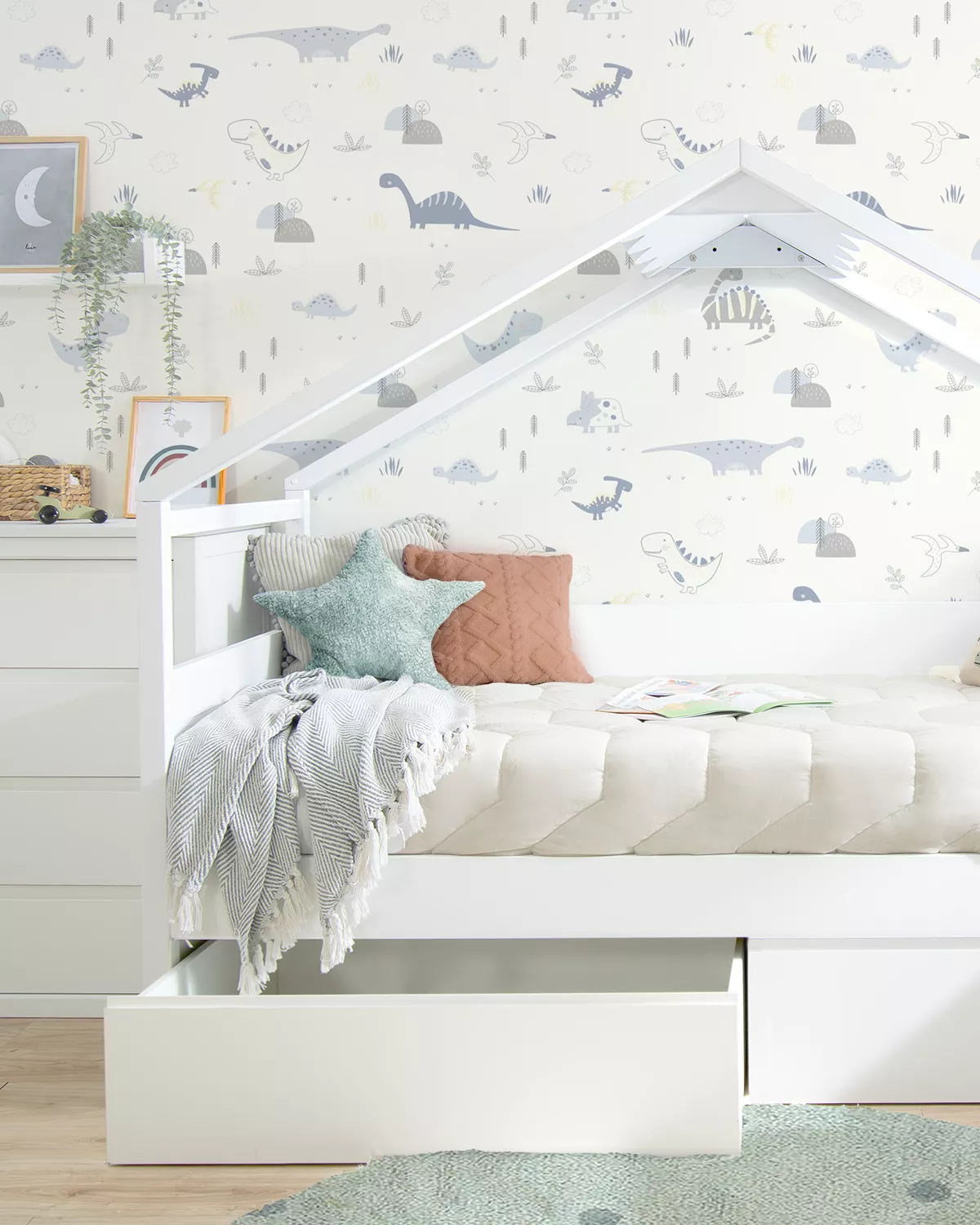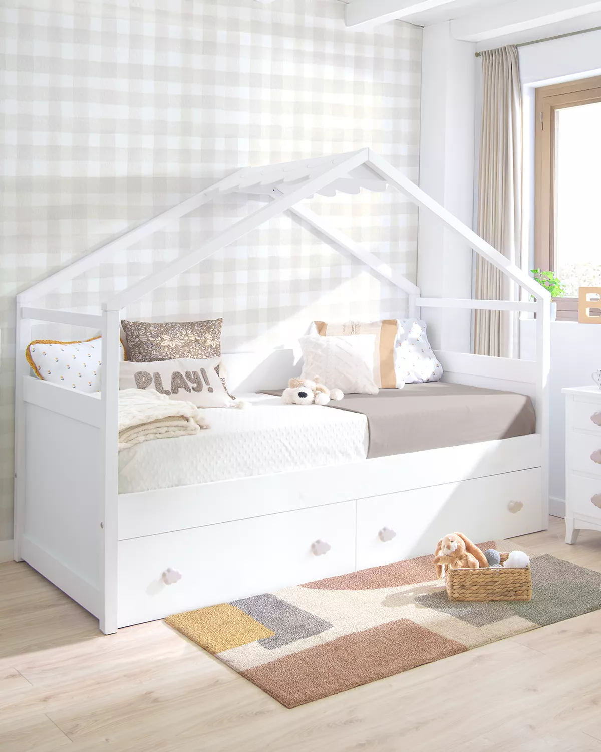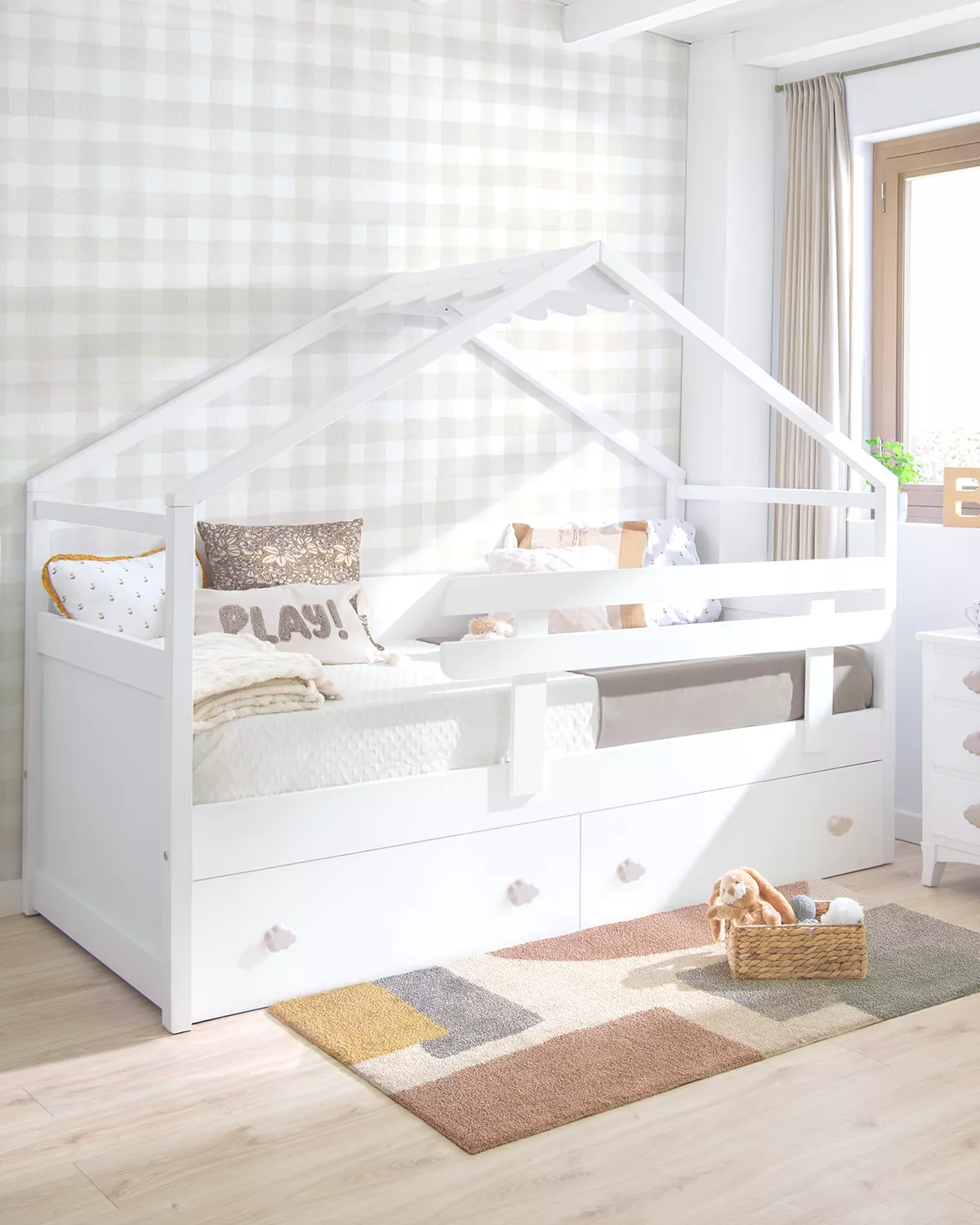 A Cama Casinha branca com gavetões é uma cama para crianças perfeita para dormitórios com espaço reduzido. Envernizada em branco com uma qualidade excepcional, com um desenho em forma de casinha, cheia de curvas e linhas que criam um ambiente perfeito para um dormitorio infanto-juvenil. Graças a sua estrutura leve mas ao mesmo tempo robusta, os teus filhos poderão aproveitá-la por muito tempo. Ademais com dois gavetões inferiores de grande capacidade, ideais para guardar todo tipo de coisa, jogos, roupas etc. Com um acabado em branco que permite combinar facilmente com qualquer espaço e estilo decorativo. São móveis duradeiros, se destacam por um desenho cheio de curvas e elegane que cria o dormitorio ideal.
