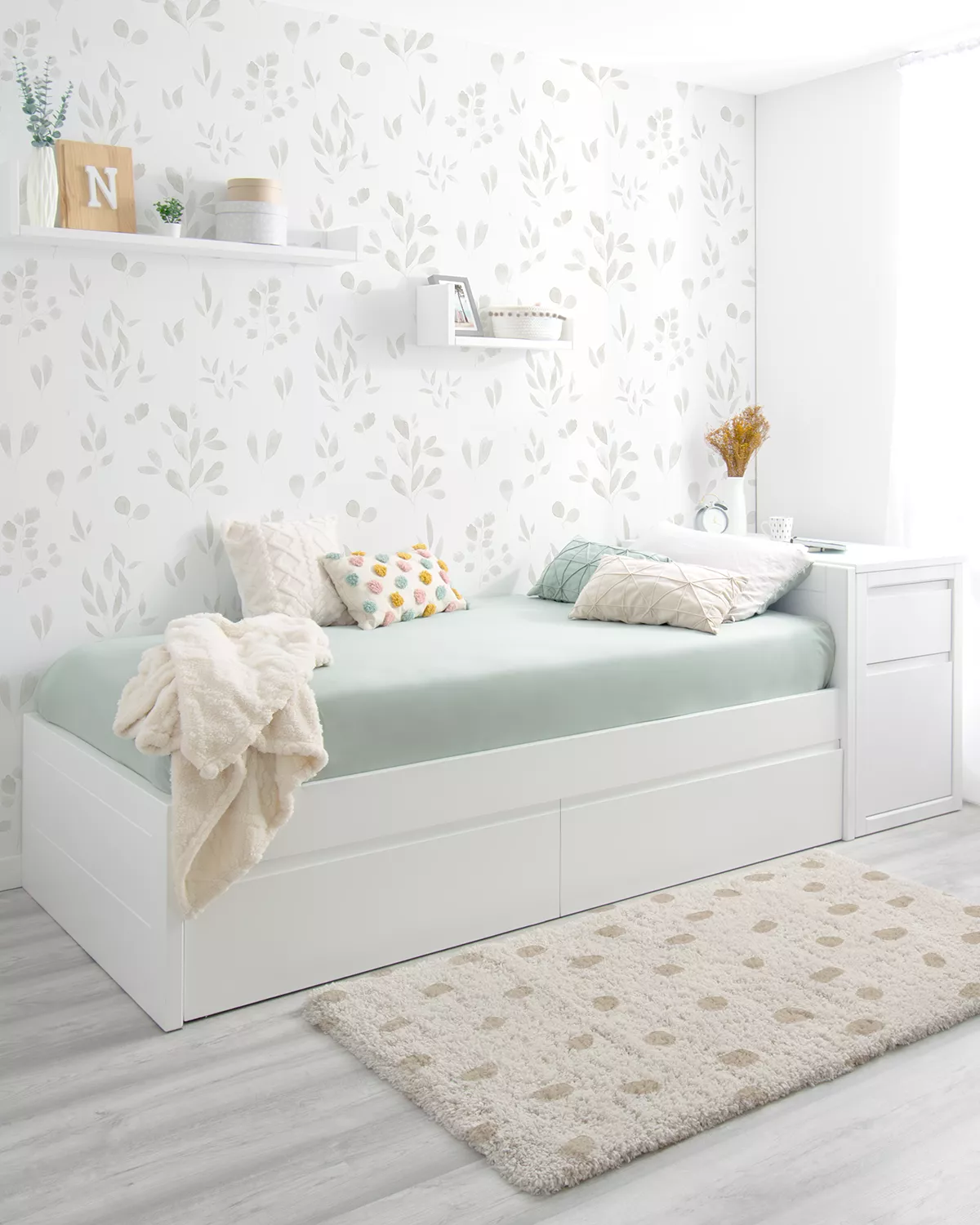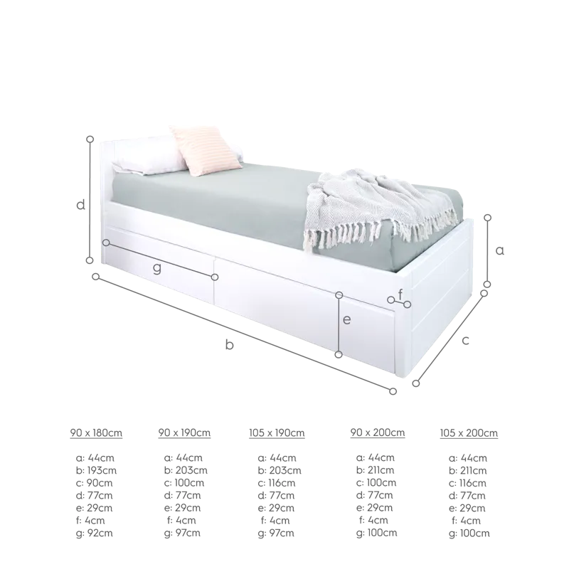 Estilo e conforto para crescer: A nossa cama com gavetas oferece uma estrutura leve mas robusta, concebida para acompanhar os seus filhos desde a infância até à idade adulta. Com uma base lacada a branco, a cama com gavetas destaca-se pelo seu calor e funcionalidade.