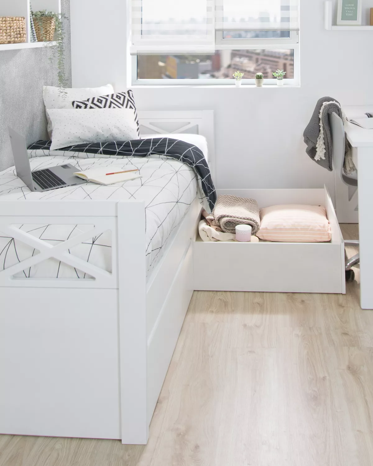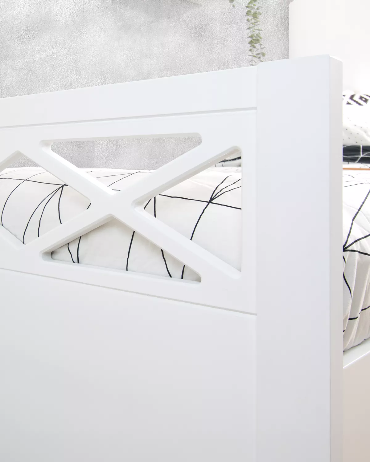 A cama Cruz com duas gavetas é uma solução ideal para quartos pequenos de jovens que procuram maximizar o espaço. Esta cama de solteiro branca, de qualidade excecional e design único, combina funcionalidade e estilo de uma forma excecional.