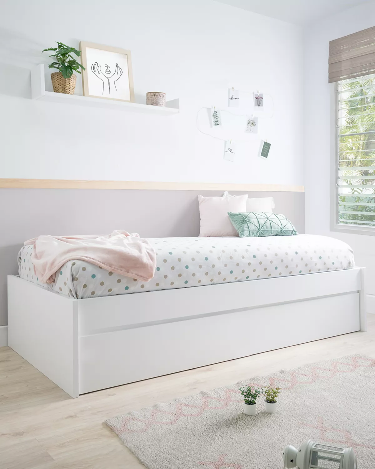 A nossa Cama Lisa Low Youth é uma cama com gavetas, perfeita para quartos com espaço limitado. Lacada na cor branca.