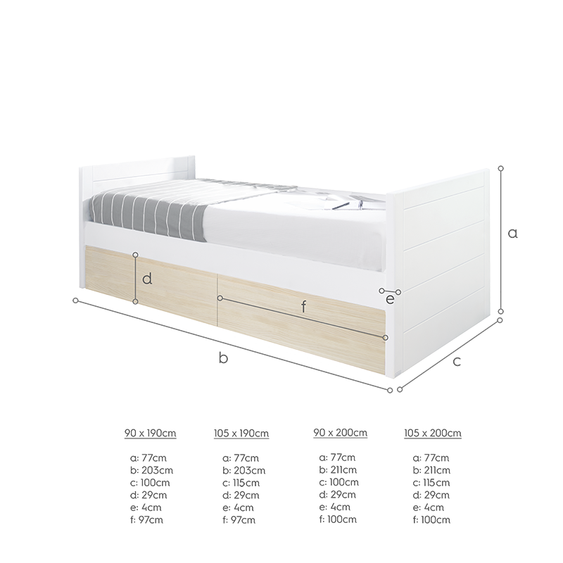 Estilo e conforto para crescer: A nossa cama com gavetas oferece uma estrutura leve mas robusta, concebida para acompanhar os seus filhos desde a infância até à idade adulta. Com uma base lacada a branco, a cama com gavetas destaca-se pelo seu calor e funcionalidade.