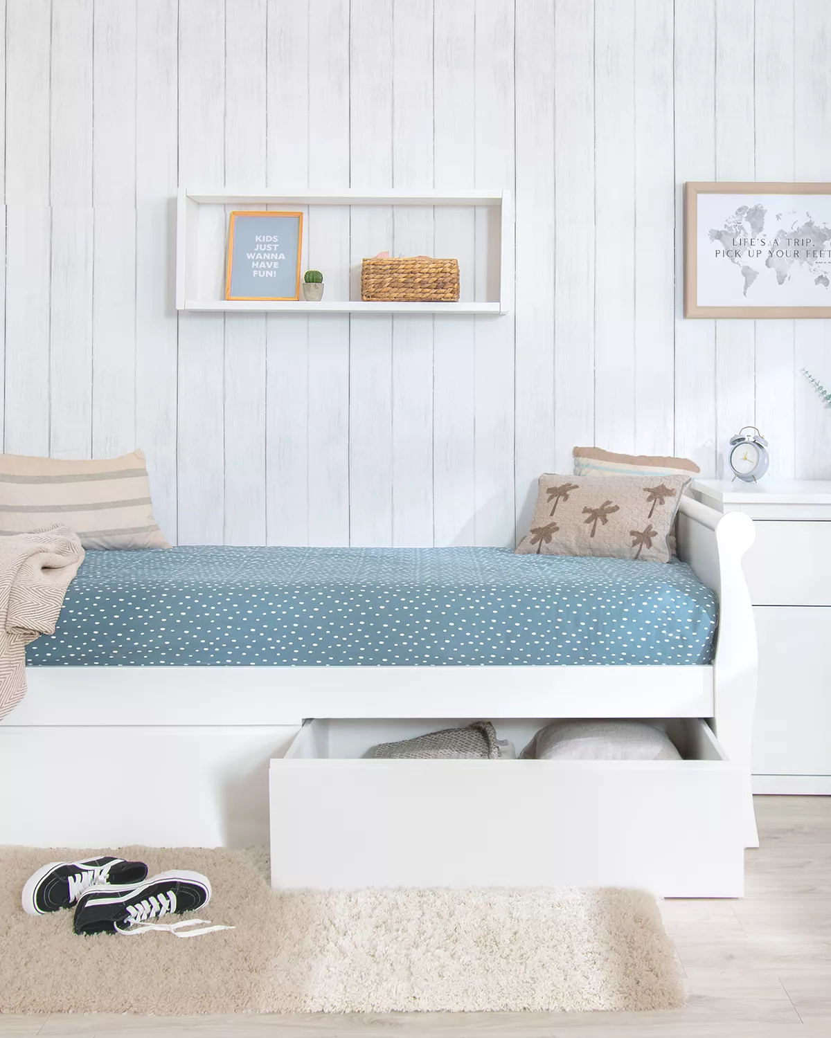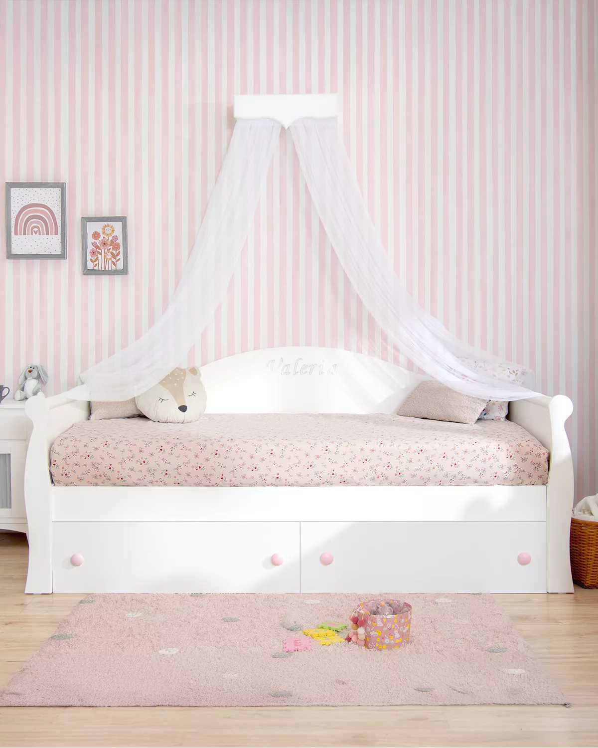 Uma cama para crianças perfeita para dormitórios com espaço reduzido. Envernizada em branco com uma qualidade excepcional. Com um desenho em forma de góndola, cheia de curvas e linhas que criam um ambiente perfeito para um dormitorio infanto-juvenil. Graças a sua estrutura leve mas ao mesmo tempo robusta, os teus filhos poderão aproveitá-la por muito tempo. Ademais com dois gavetões inferiores de grande capacidade, ideais para guardar todo tipo de coisa, jogos, roupas etc. Com um acabado em branco que permite combinar facilmente com qualquer espaço e estilo decorativo. São móveis duradeiros, se destacam por um desenho cheio de curvas e elegane que cria o dormitorio ideal.