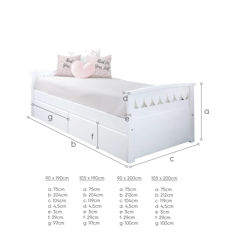 A Cama Corações com gavetas é uma cama para crianças perfeita para dormitórios com espaço reduzido. Envernizada em branco com uma qualidade excepcional, cheia de curvas e linhas que criam um ambiente perfeito para um dormitorio infanto-juvenil. Graças a sua estrutura leve mas ao mesmo tempo robusta, os teus filhos poderão aproveitá-la por muito tempo. Ademais com dois gavetões inferiores de grande capacidade, ideais para guardar todo tipo de coisa, jogos, roupas etc. Com um acabado em branco que permite combinar facilmente com qualquer espaço e estilo decorativo. São móveis duradeiros, se destacam por um desenho cheio de curvas e elegane que cria o dormitorio ideal.