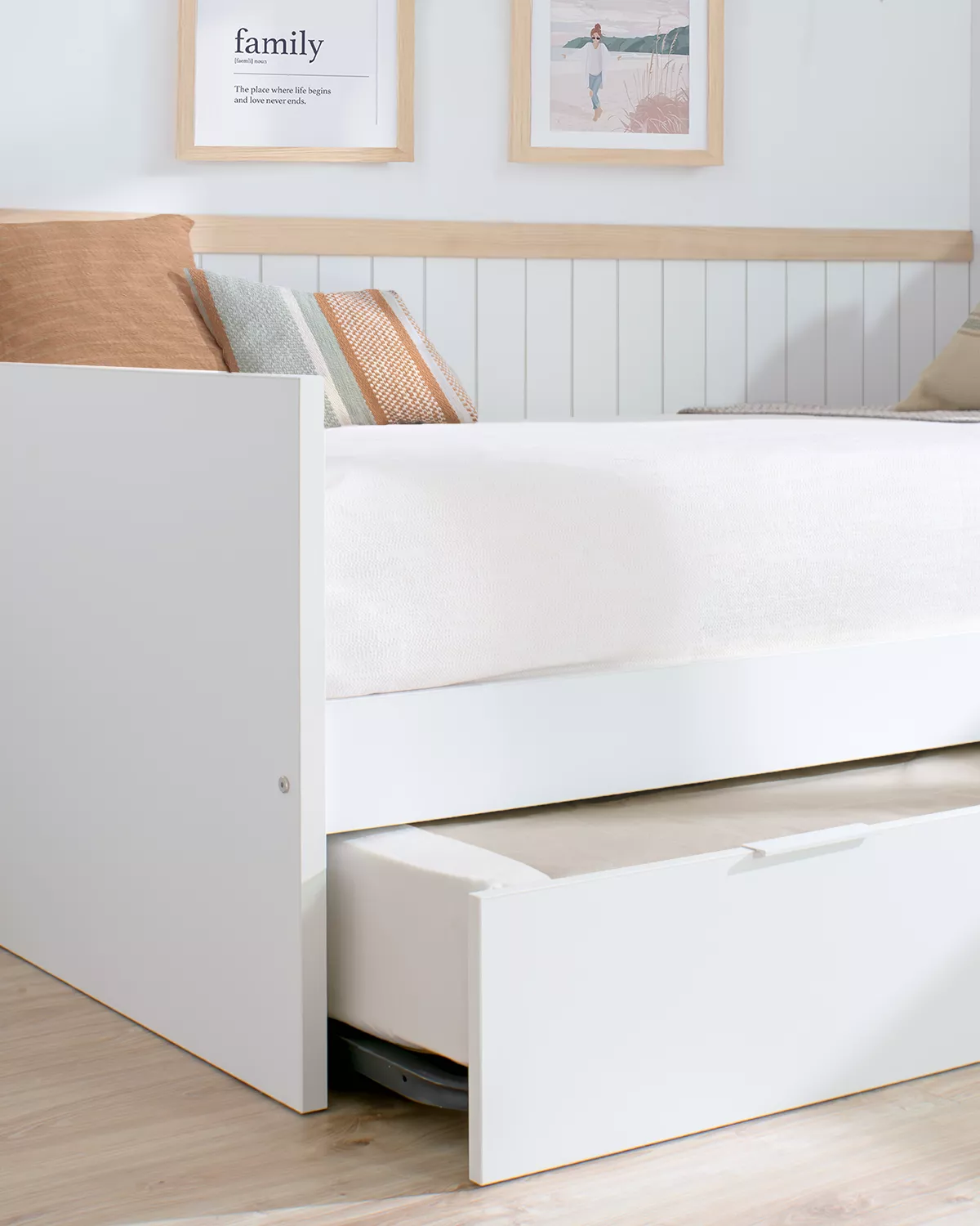 A nossa cama de solteiro laminada branca é uma solução versátil e funcional, concebida para satisfazer as necessidades das famílias modernas. Ideal para quartos de crianças ou adolescentes, este modelo alia estilo, durabilidade e um preço mais acessível graças à sua construção em melamina de alta qualidade.