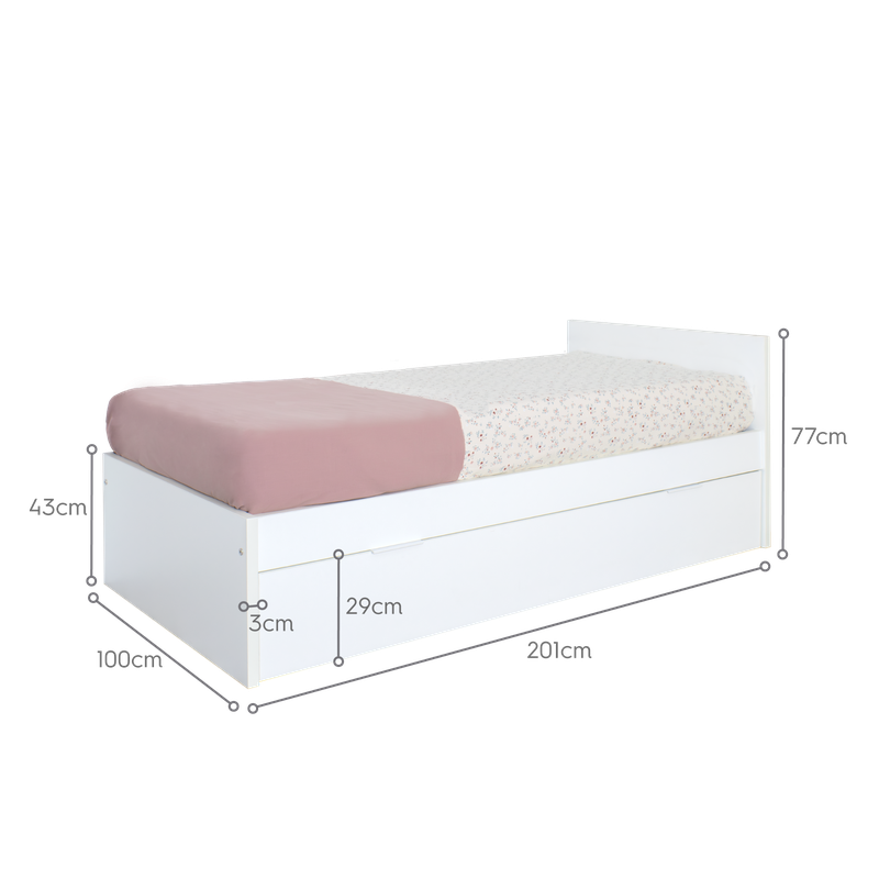 A nossa cama de rodízio branca com estrado baixo laminado é uma solução versátil e funcional, concebida para se adaptar às necessidades das famílias modernas. Ideal para quartos de crianças ou adolescentes, este modelo alia estilo, durabilidade e um preço mais acessível graças à sua construção em melamina de alta qualidade.