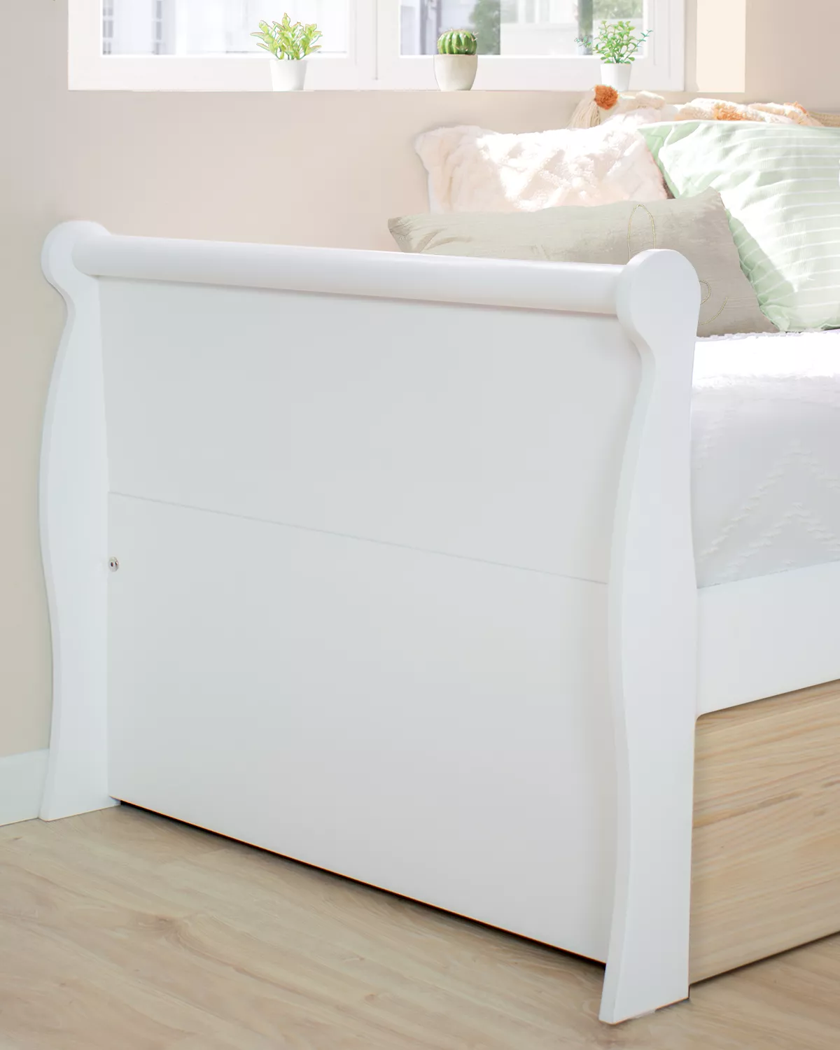 Estilo e conforto para crescer: a estrutura leve, mas resistente, da nossa cama auxiliar foi concebida para acompanhar os seus filhos desde a infância até à idade adulta. Com uma base lacada a branco e detalhes em madeira de pinho natural, esta cama de solteiro destaca-se pelo aconchego e simplicidade do design nórdico.