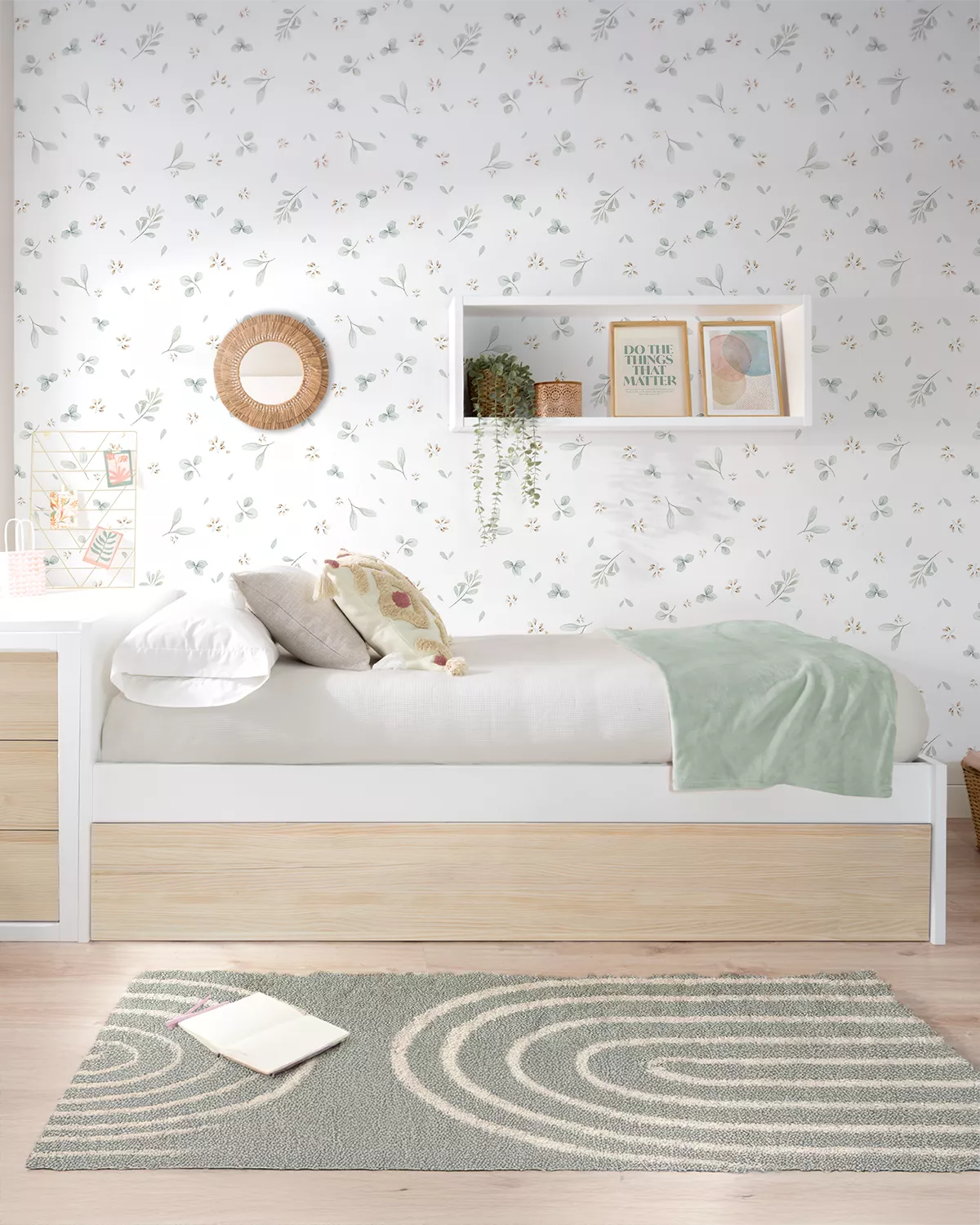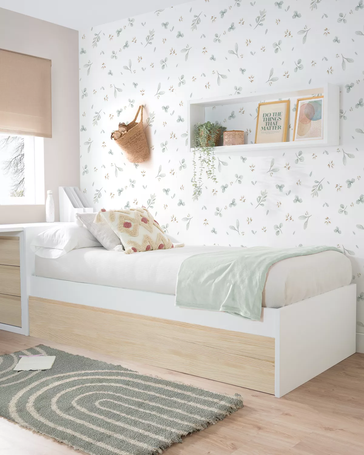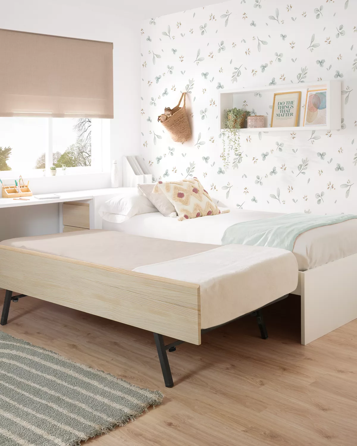 Descubra a combinação perfeita de design e funcionalidade com a nossa Cama Linear Trundle em branco e madeira natural com um estrado liso e baixo, pensada para espaços juvenis e infantis com um toque nórdico. Esta elegante peça de mobiliário não é apenas um deleite visual, mas também uma solução prática para quartos mais pequenos.