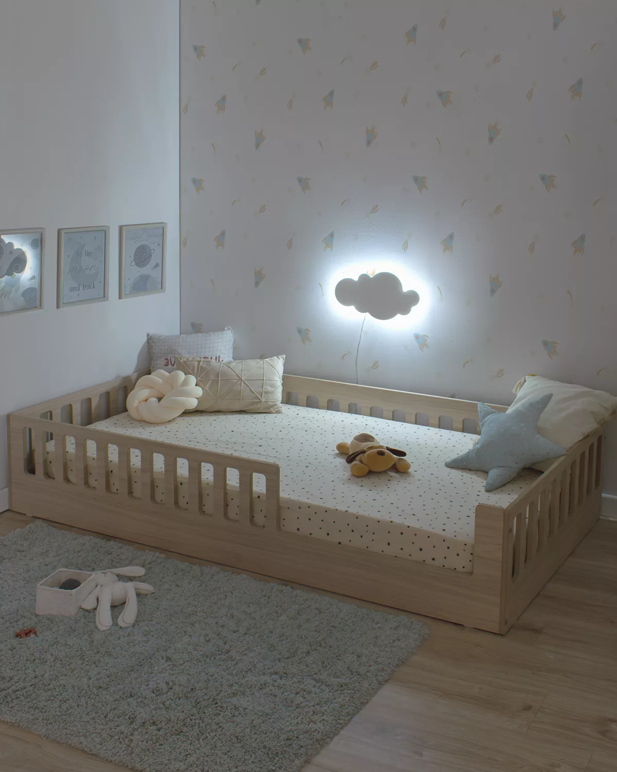 A Cama de Criança com Barras Montessori - CRETA é a escolha perfeita para os pais que procuram uma cama Montessori original e de alta qualidade. Esta cama foi concebida segundo os princípios Montessori, com uma estrutura baixa que permite à criança subir e descer facilmente, favorecendo a sua independência e o seu desenvolvimento motor.