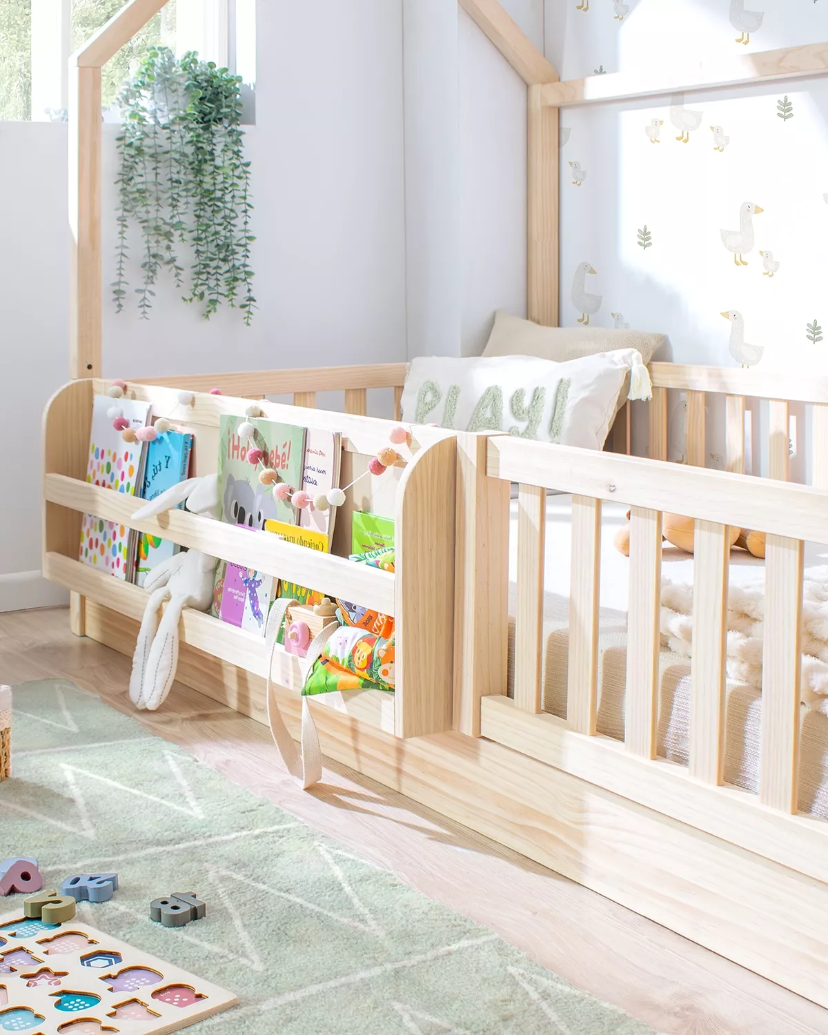 A barreira extra para camas Montessori da Bainba foi desenhada exclusivamente para as nossas camas casinha evolutivas em madeira natural.