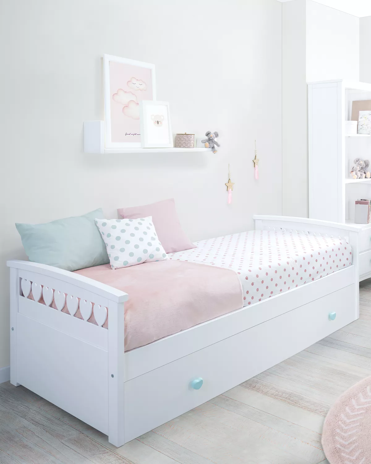 Cama para crianças dupla Corações apresenta um desenho diferente único, feita em madeira de pino natural maciça. Criará um ambiente perfeito para o quarto infantil. Graças a sua estrutura leve e robusta os teus filhos poderão utilizá-la perfeitamente ao longo dos anos. Ademais são duas camas em  uma. Ideal para visitas, para um irmãozinho, amigos etc… Com um acabado natural que permite combinar facilmente com diversos tipos de espaços e estilos decorativos. Ademais, são móveis duradouros que destacam pelo seu desenho cheio de curvas e elegância que criará o dormitorio ideal.