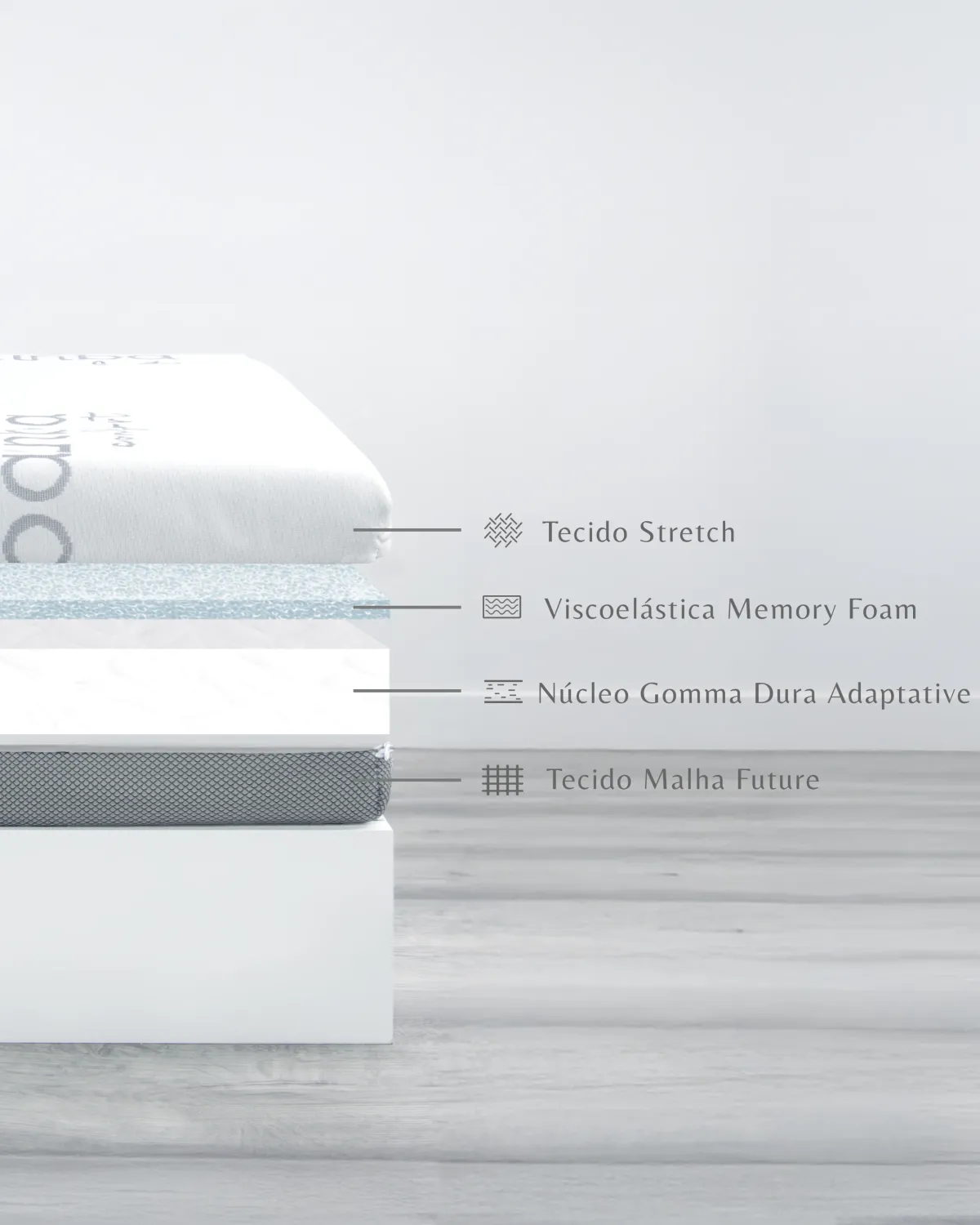 Núcleo de espuma firme, com camadas de espuma soft em ambos os lados, proporcionando um equilíbrio perfeito entre firmeza e conforto incomparável.