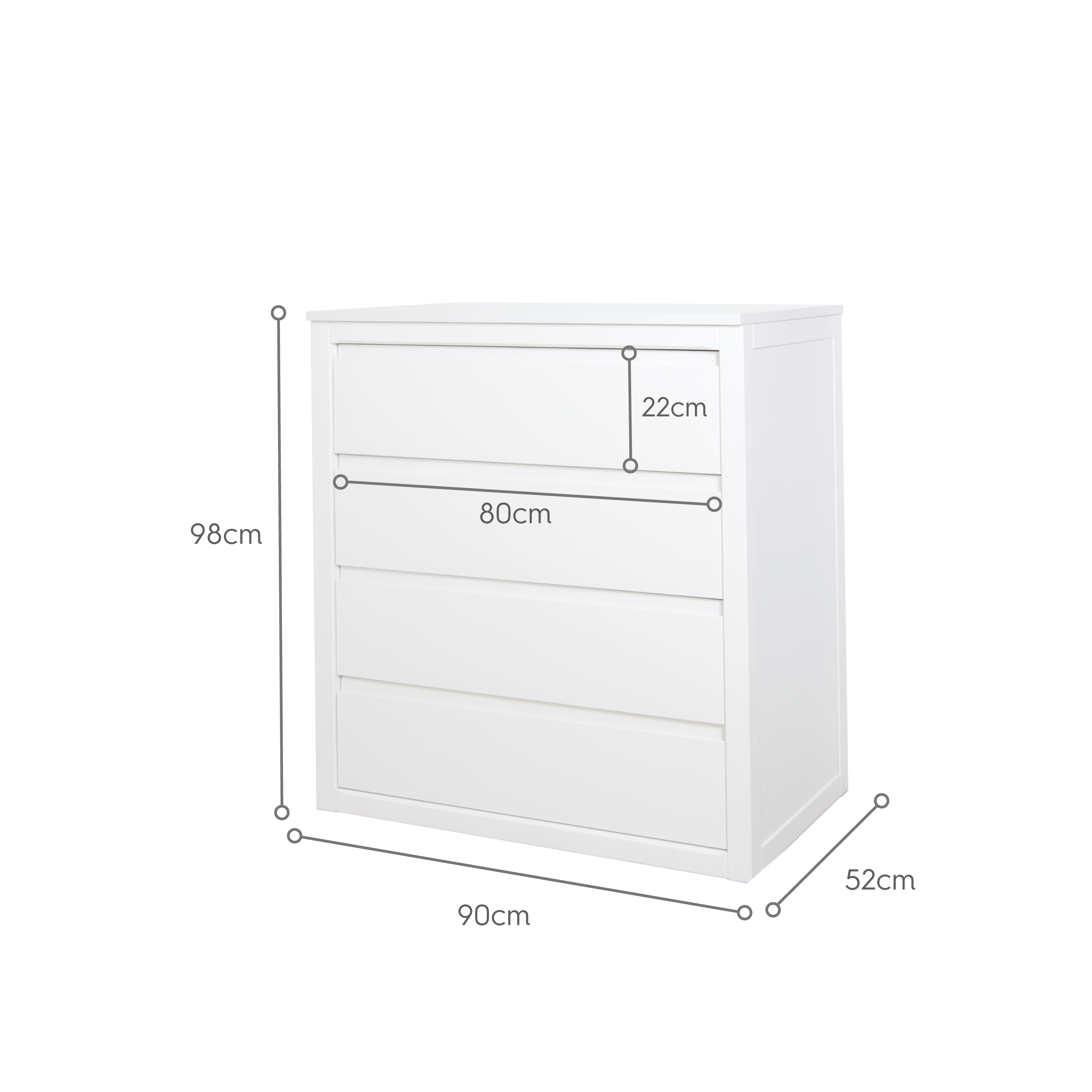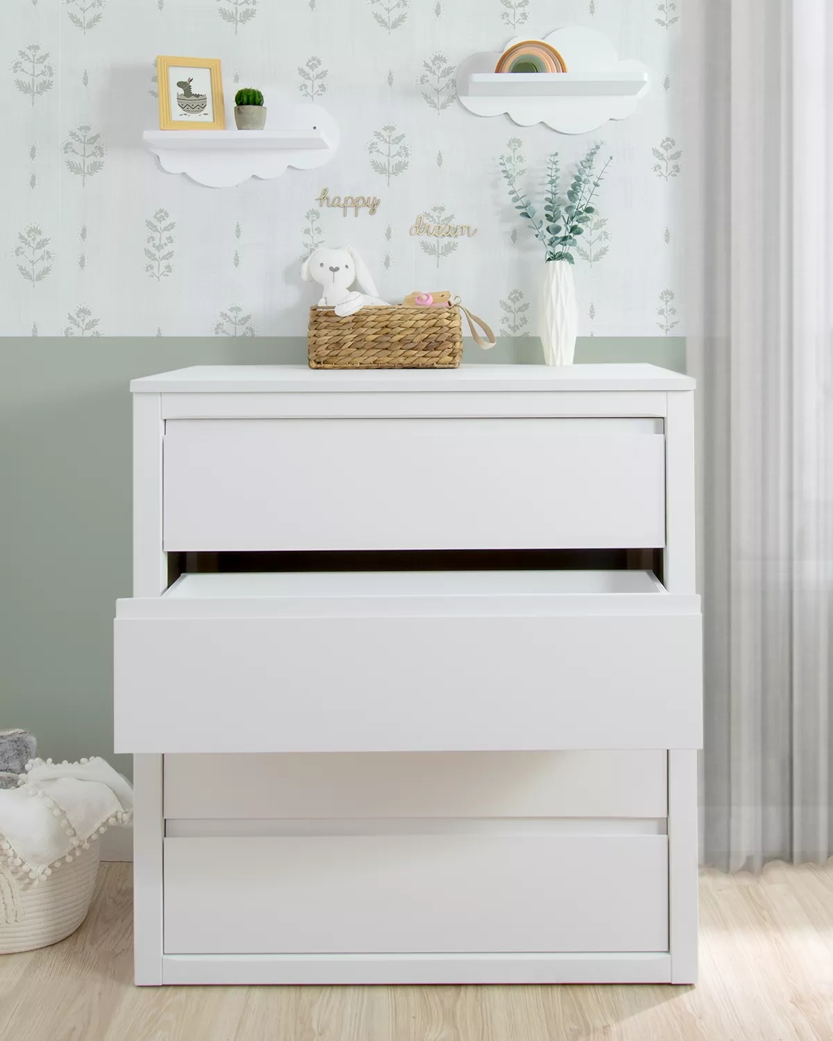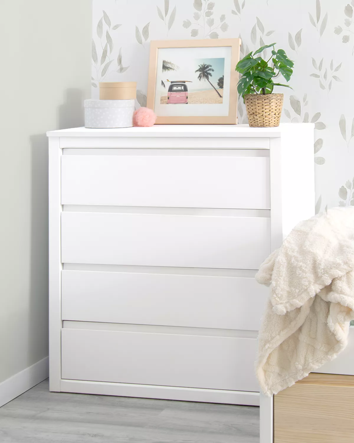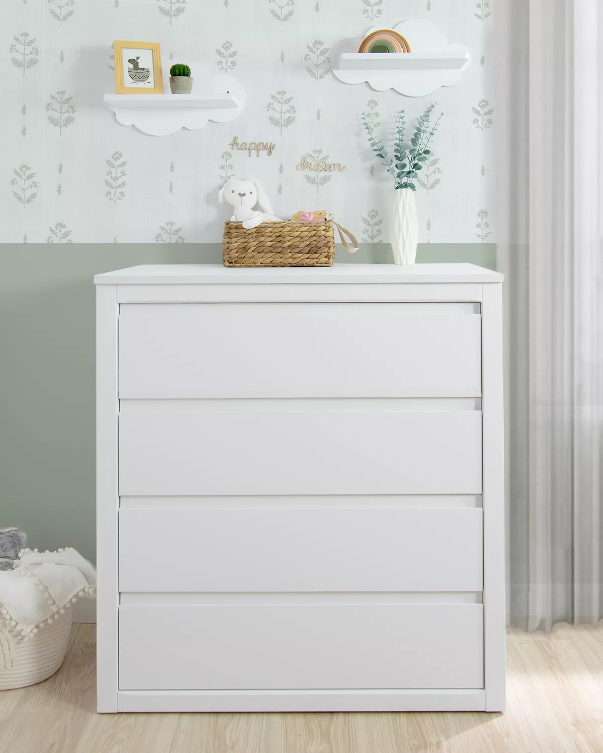 Conta com 4 amplas gavetas com frontal de abertura por puxadores embutidos.