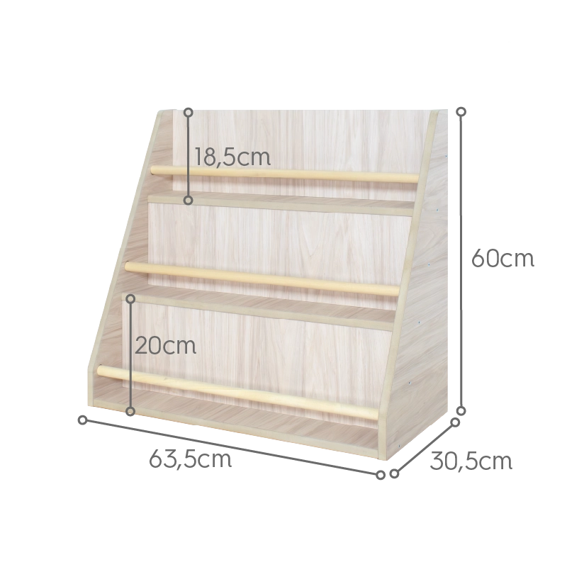 Esta estante adapta-se a qualquer decoração infantil e dá um toque natural e acolhedor ao quarto. As suas 3 prateleiras proporcionam o espaço ideal para organizar e manter arrumadas todas as suas histórias favoritas, ajudando as crianças a selecionar e devolver os livros sozinhas, sem necessidade da ajuda de um adulto.