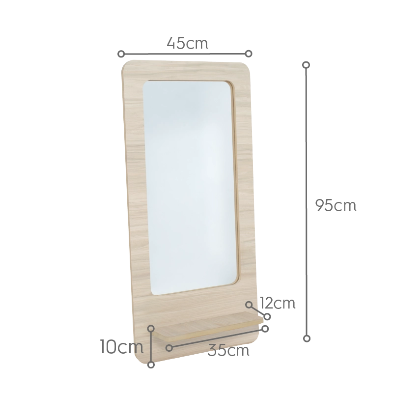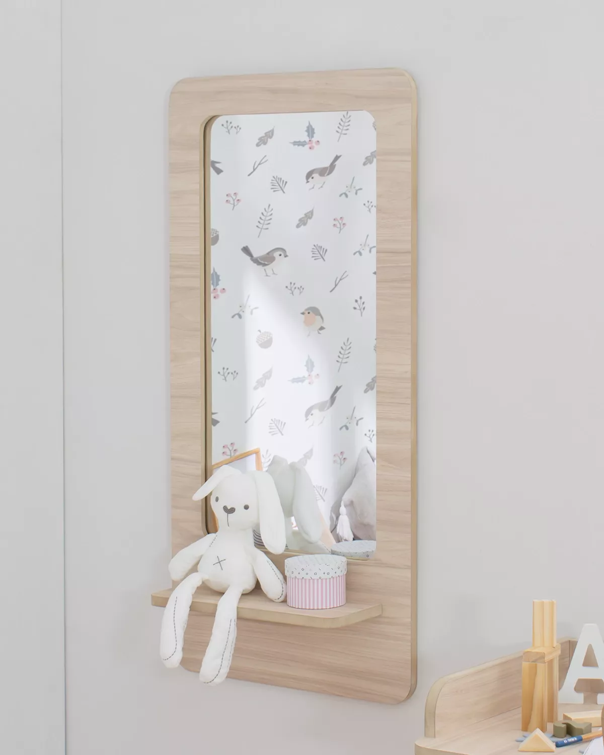 Este espelho para crianças é uma peça de mobiliário indispensável que não só acrescenta funcionalidade, mas também um toque decorativo ao quarto. A prateleira incorporada é perfeita para deixar os seus brinquedos ou pequenos tesouros, incentivando a ordem e a autonomia.