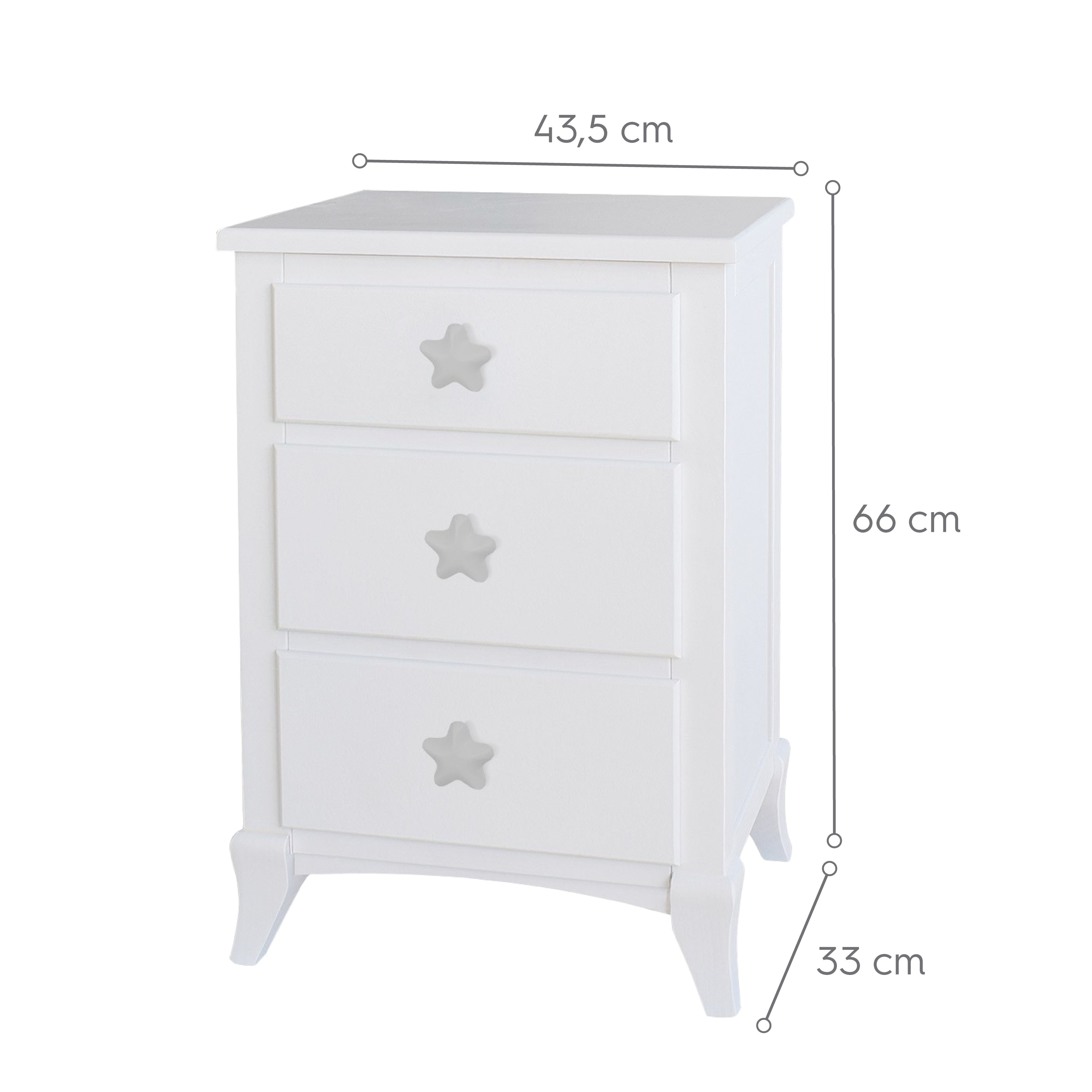 A mesa de cabeceira infantil/ juvenil com gavetas, é perfeita para qualquer dormitório infantil ou juvenil. Com um desenho de linhas retas criarão o ambiente ideal. Este móvel é envernizado em branco e combinará perfeitamente com outros móveis, ademais, possui três gavetas que ajudarão a guardar todo o necessário.