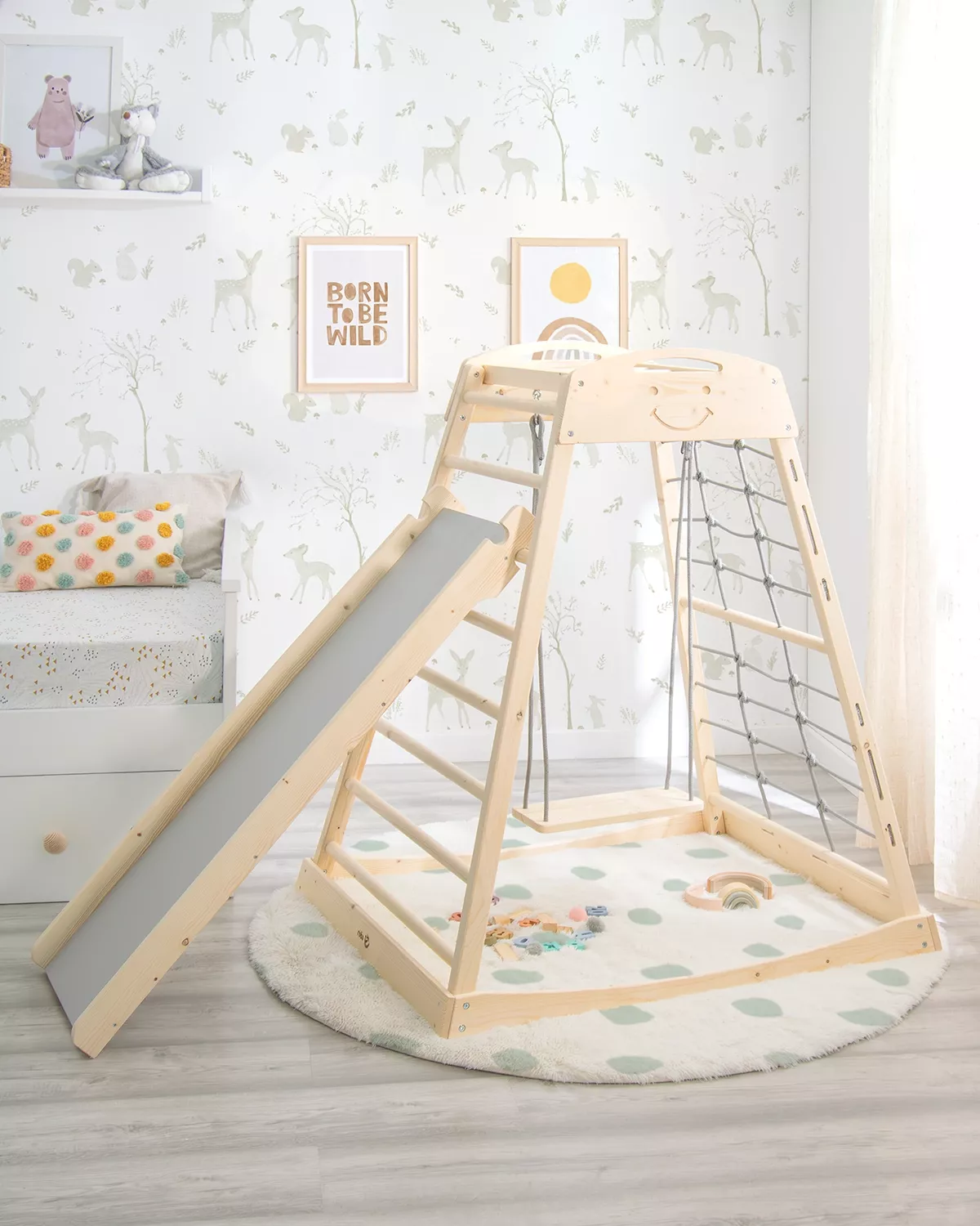 Adicione uma nova dimensão ao jogo Montessori com esta rampa deslizante e de escalada em madeira. Compatível com o triângulo e a torre, permite que as crianças deslizem ou escalem, fortalecendo sua motricidade, equilíbrio e autonomia.