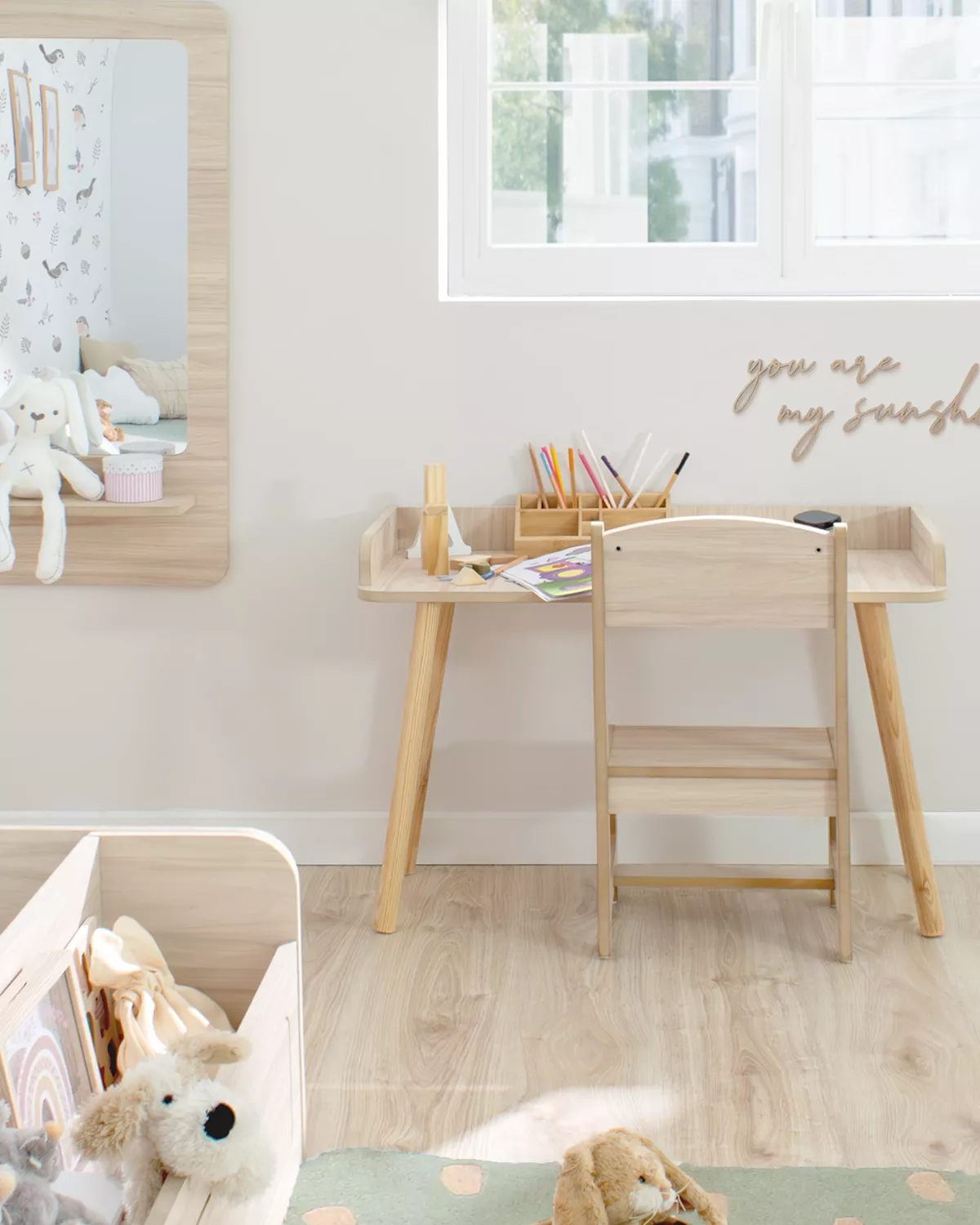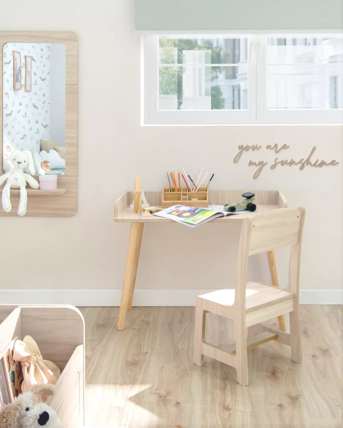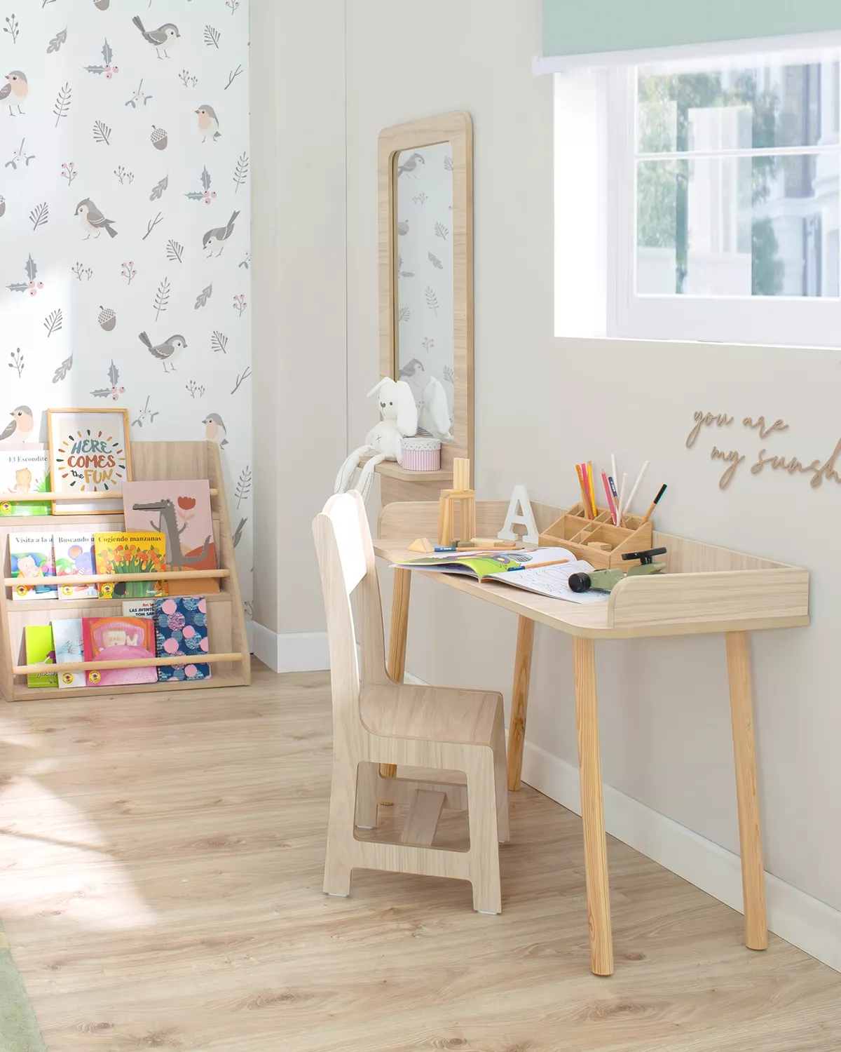 Fabricada em madeira de alta qualidade, a secretária é robusta e duradoura, ideal para suportar a utilização diária. O seu design minimalista e natural em madeira de bétula confere calor e elegância a qualquer espaço infantil, tornando-a numa peça decorativa e funcional.