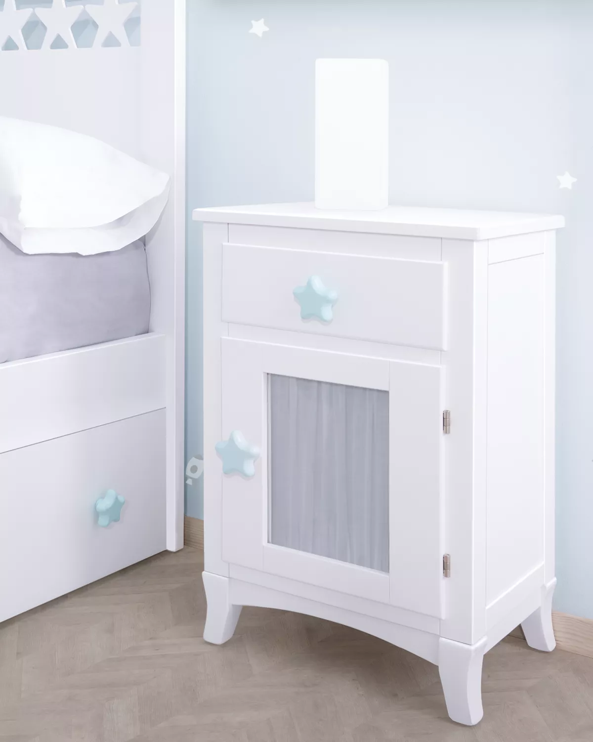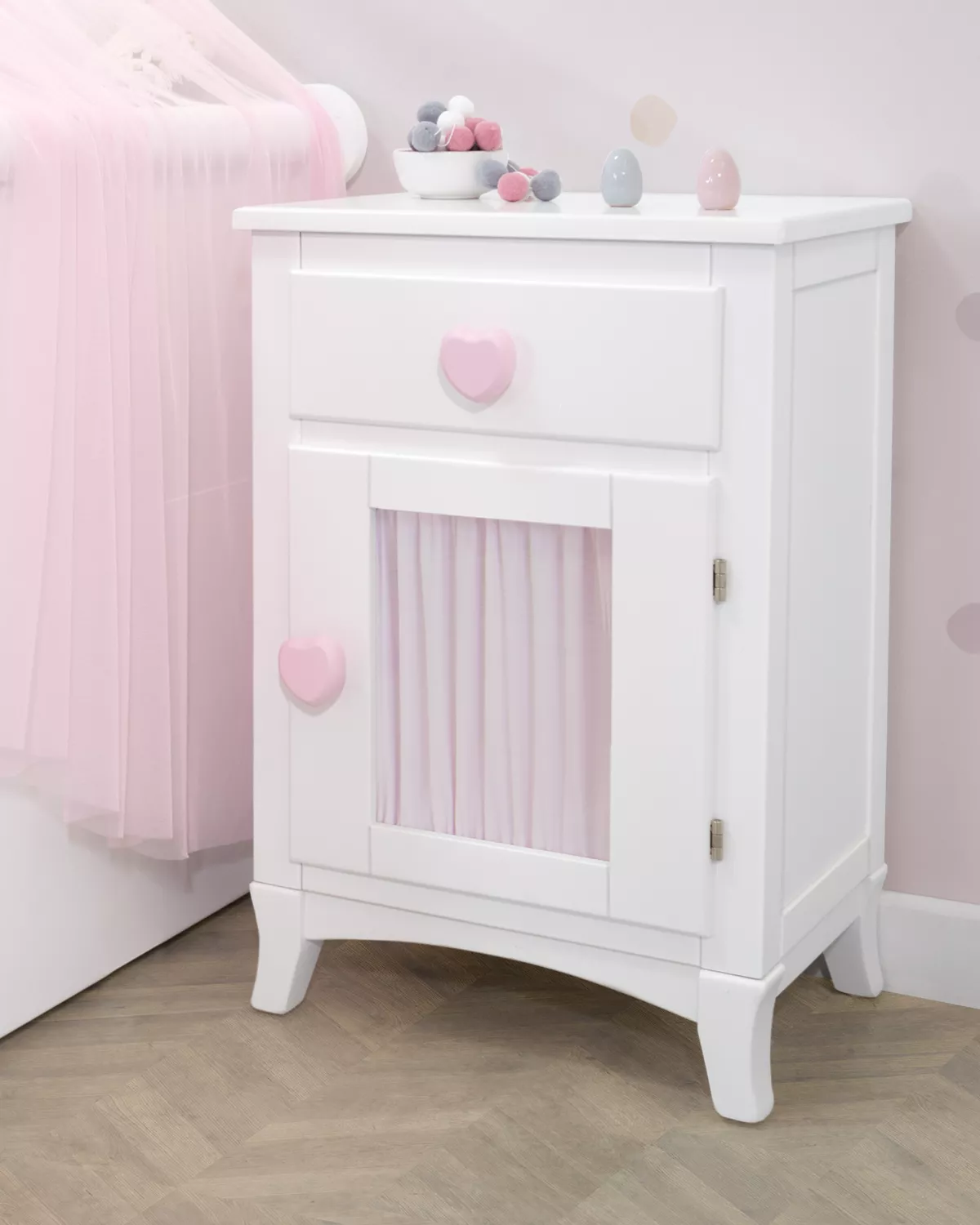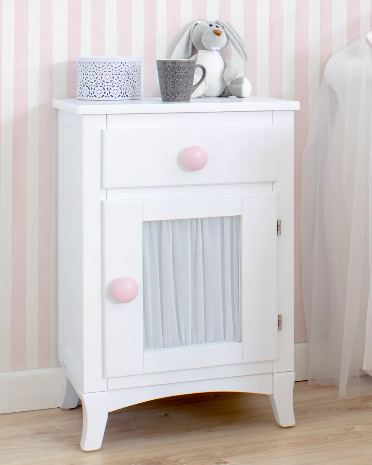 mesa de cabeceira infantil/ juvenil com porta e cortina, é perfeita para qualquer dormitório infantil ou juvenil. Com um desenho de linhas retas criarão o ambiente ideal. Este móvel é envernizado em branco  e combinará perfeitamente com outros móveis, ademais, possui três gavetas que  ajudarão a guardar todo o necessário.