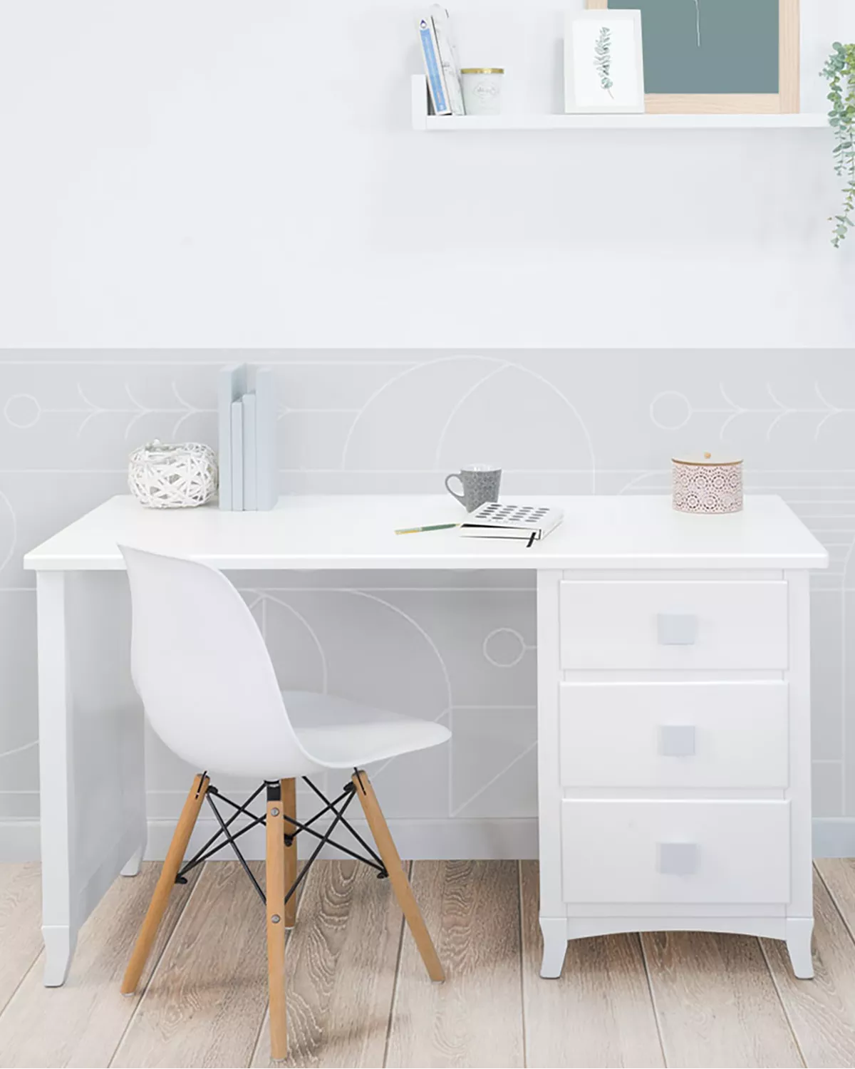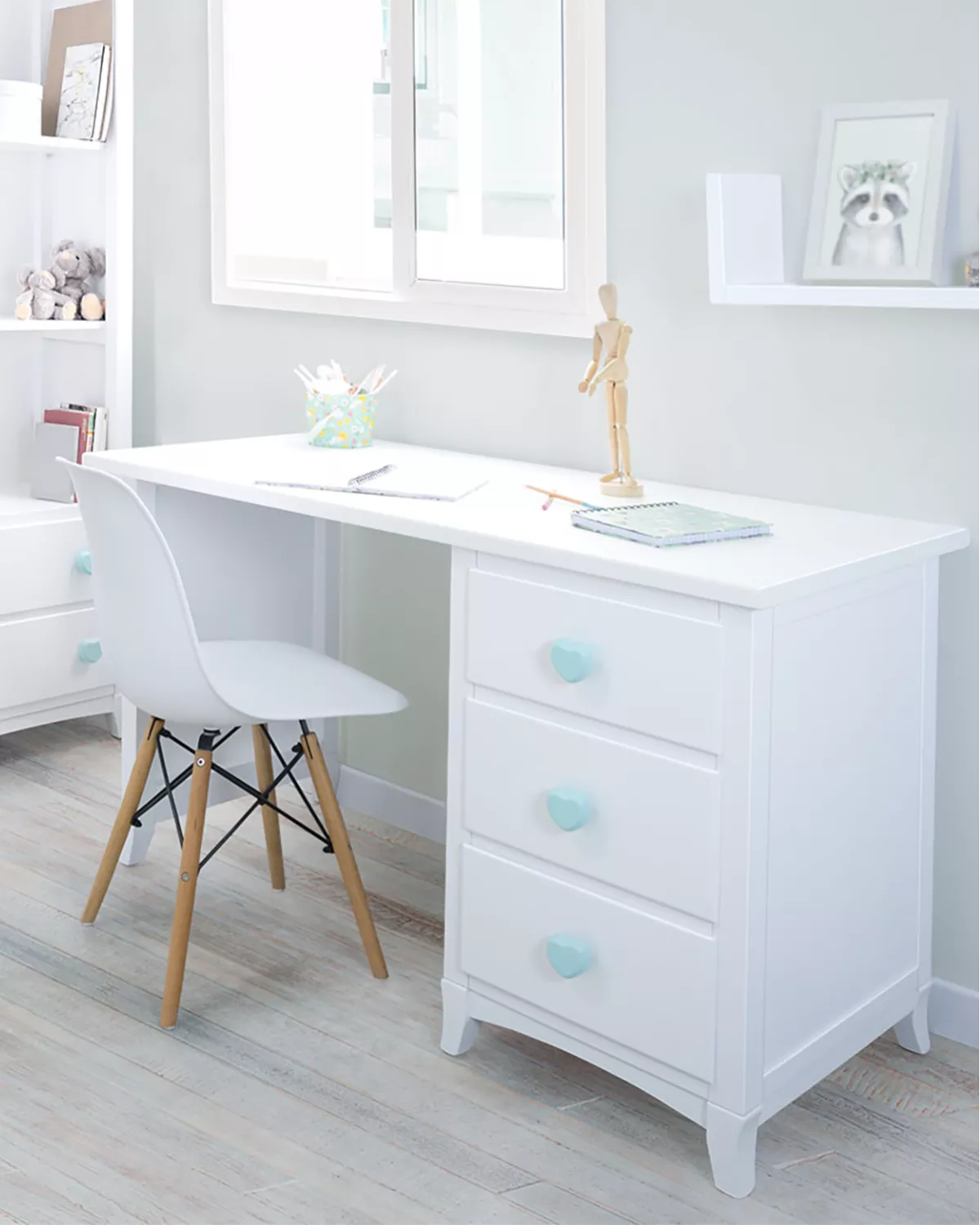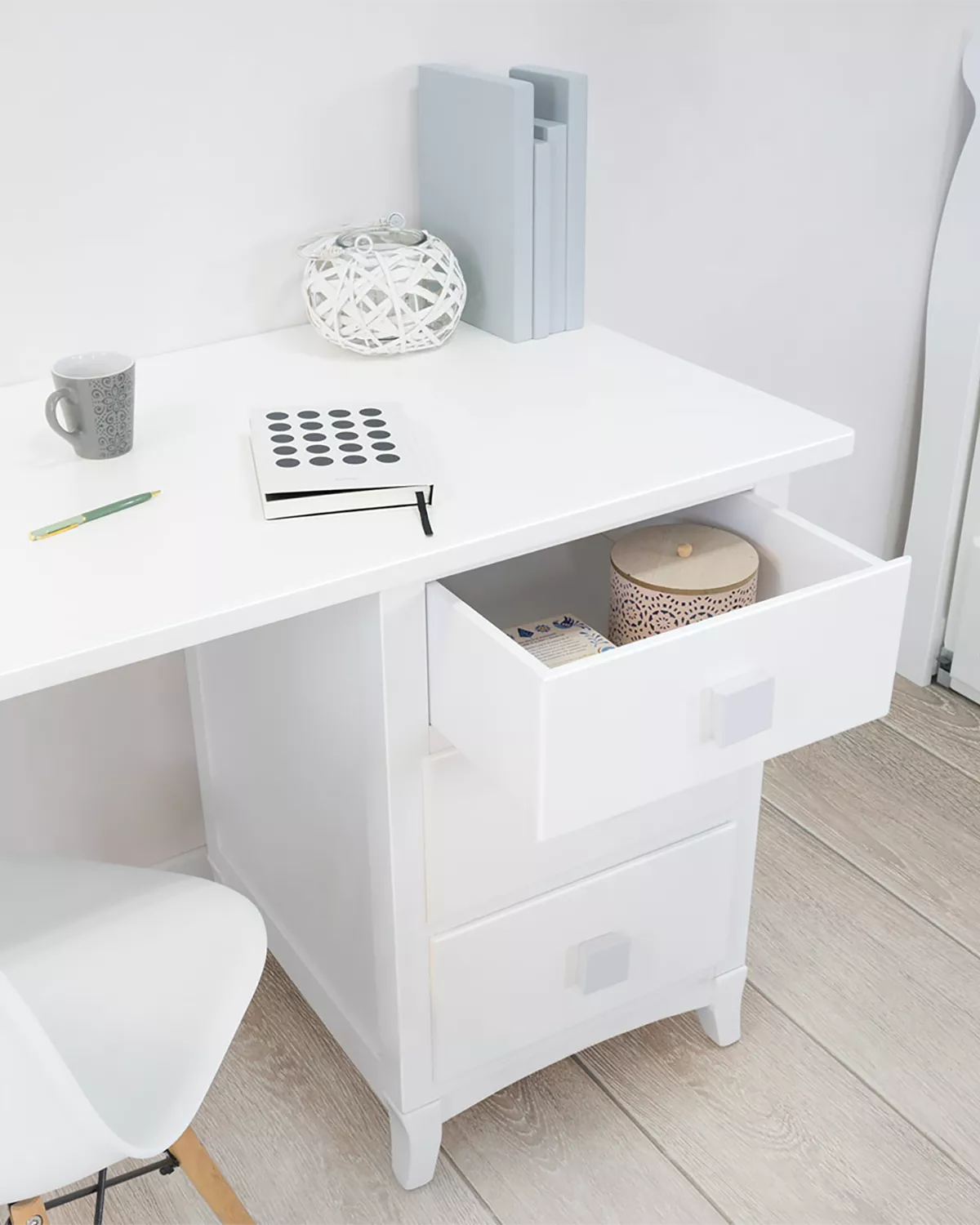 Secretária lacada a branco: Graças ao seu acabamento em laca branca, esta secretária não só tem um aspeto moderno e limpo, como também ajuda as crianças a manterem-se concentradas na sua área de estudo.