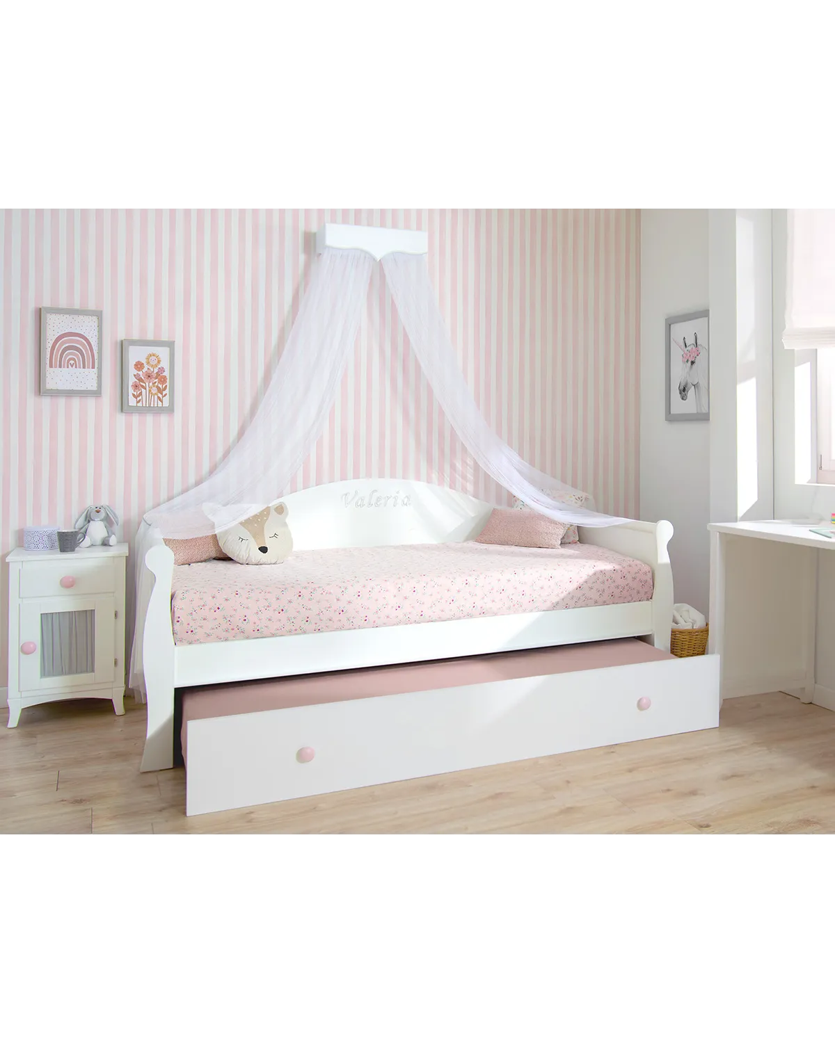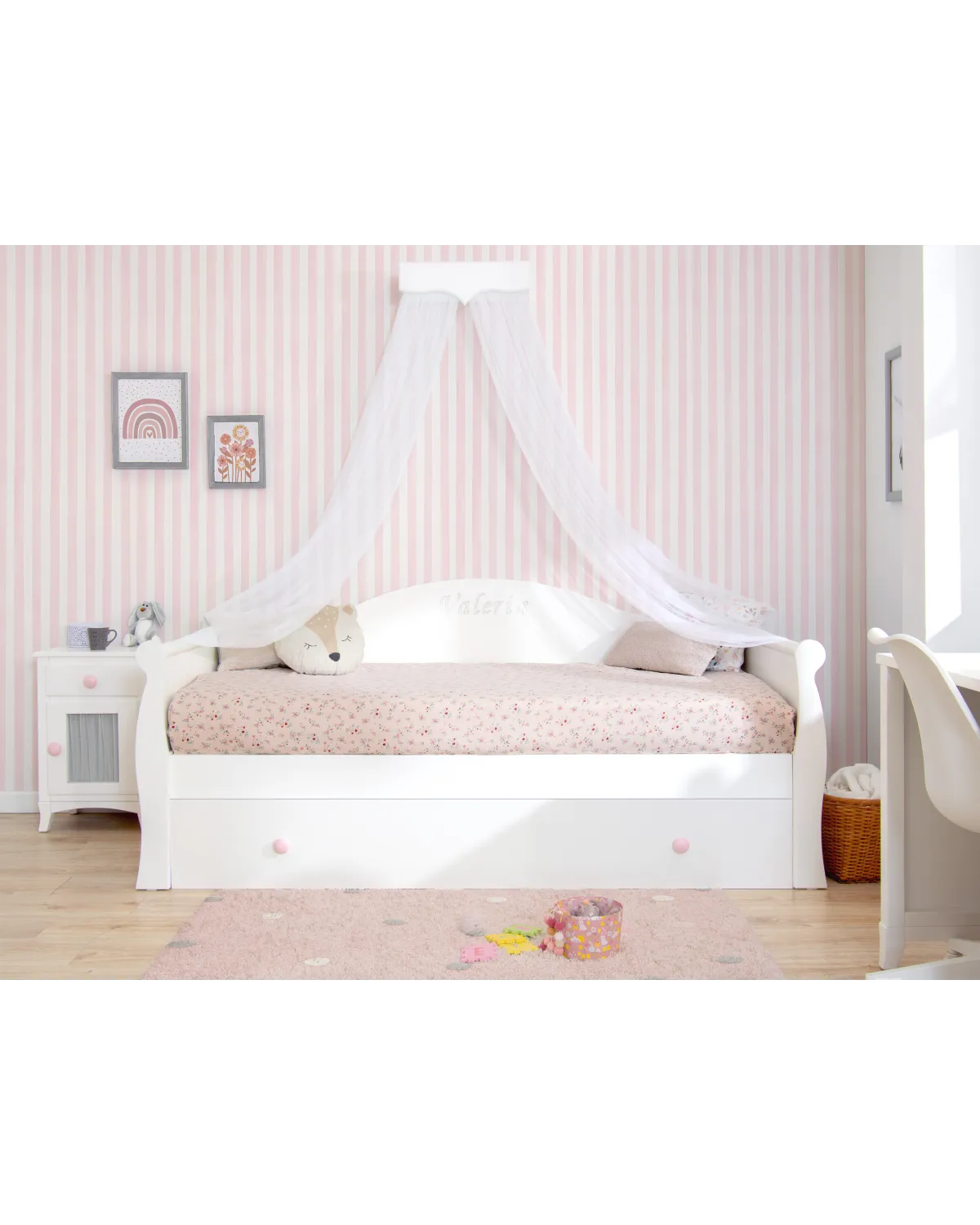 Graças à sua estrutura leve mas ao mesmo tempo robusta, nossos móveis poderão ser utilizados ao longo de muitos anos, a cama deste quarto possui uma cama dupla extraível , ideal para receber visitantes, amigos ou mesmo um irmãozinho.