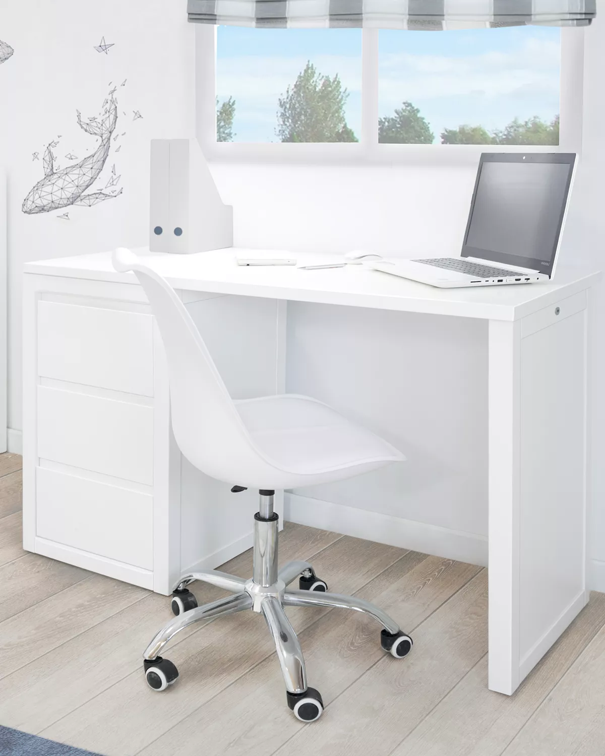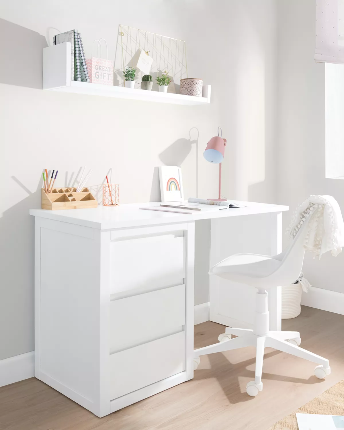 Secretária lacada a branco: Graças ao seu acabamento em laca branca, esta secretária não só tem um aspeto moderno e limpo, como também ajuda as crianças a manterem-se concentradas na sua área de estudo.