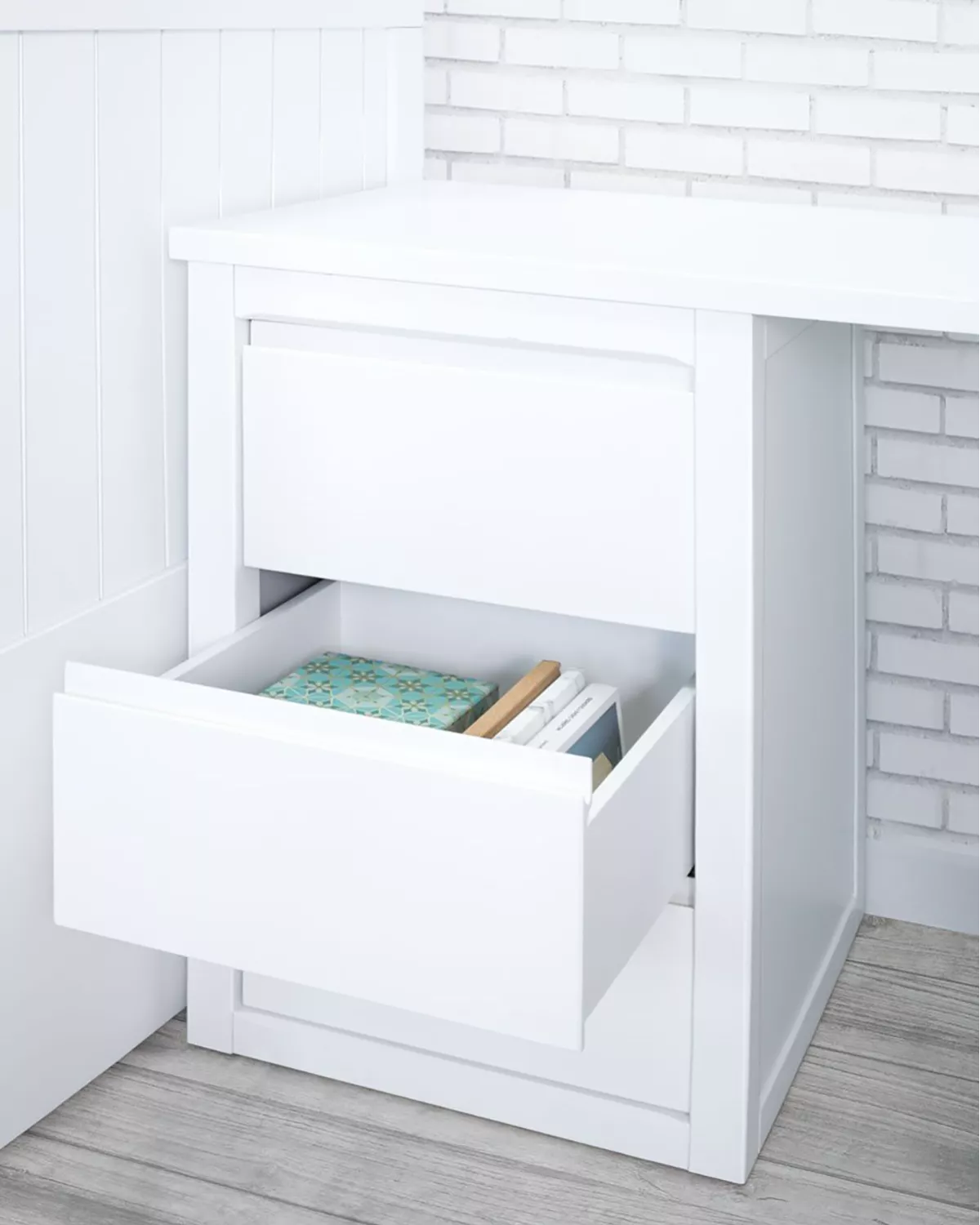 Espaço organizado: A unidade de gavetas integrada oferece um espaço de arrumação prático para livros e tudo o que for necessário, mantendo tudo ao alcance das crianças e ajudando a manter a ordem.