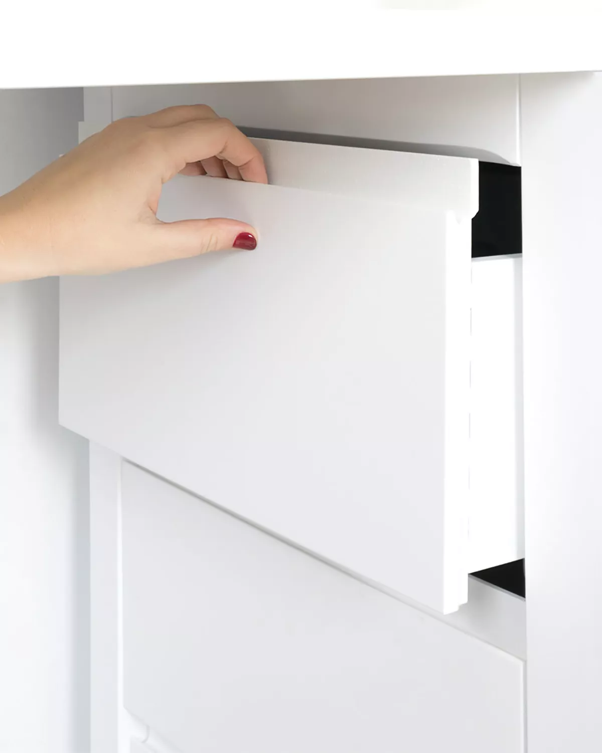 Acabamento lacado branco: O nosso acabamento branco acetinado não só é esteticamente agradável e fácil de combinar com diferentes estilos de decoração, como también proporciona uma proteção adicional, tornando o mobiliário mais resistente e durável.