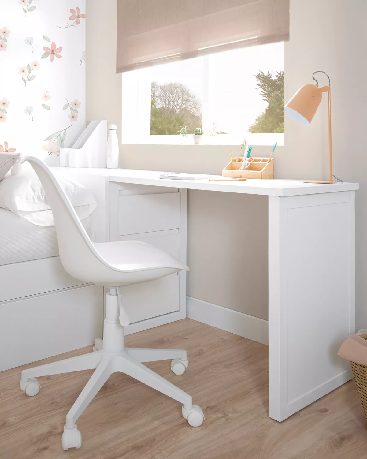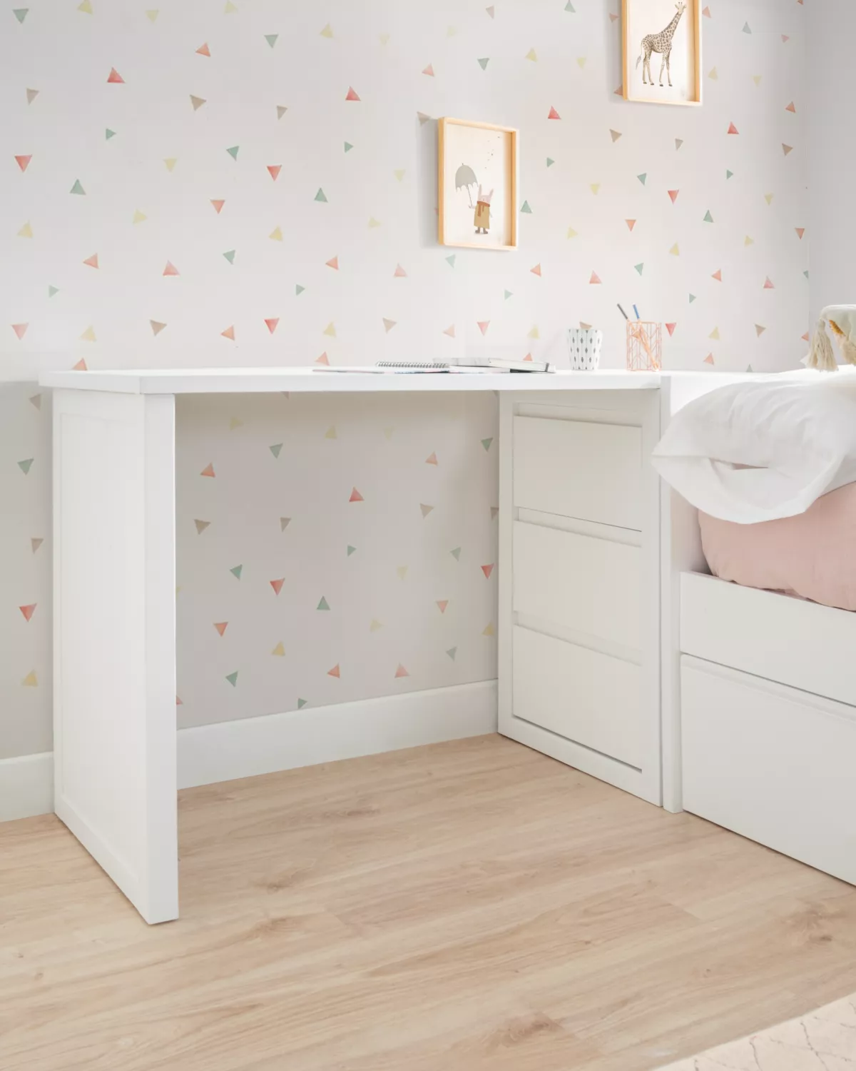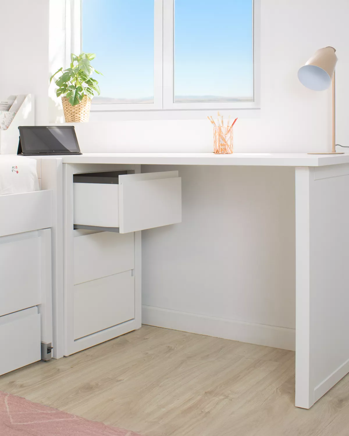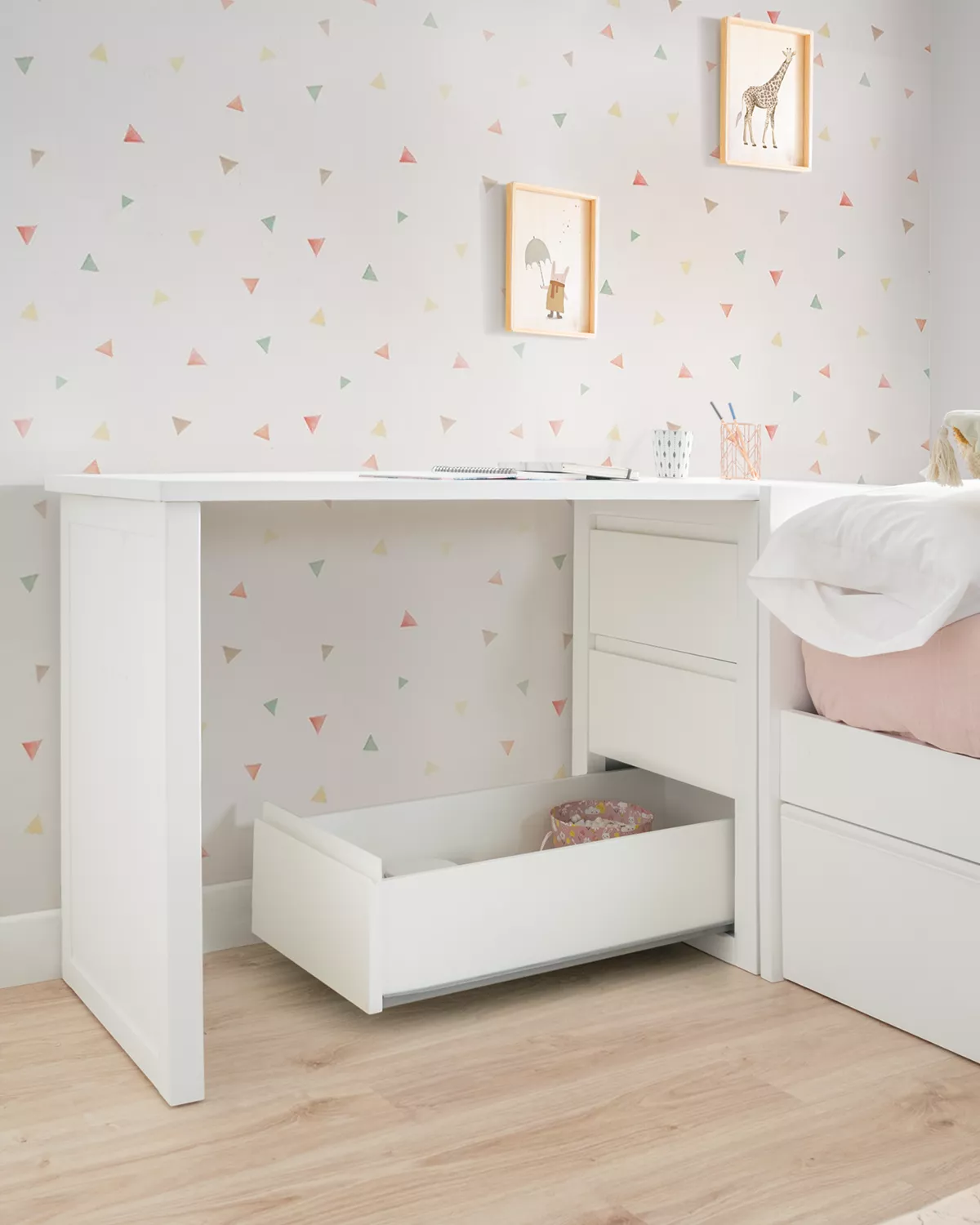 A nossa secretária juvenil com gaveteiro é a opção ideal para quartos com espaço reduzido. Projetada a pensar na integração dos móveis no quarto, permite-te aproveitar ao máximo cada centímetro disponível. O seu acabamento em branco confere-lhe versatilidade, encaixando perfeitamente em qualquer quarto infantil ou juvenil.