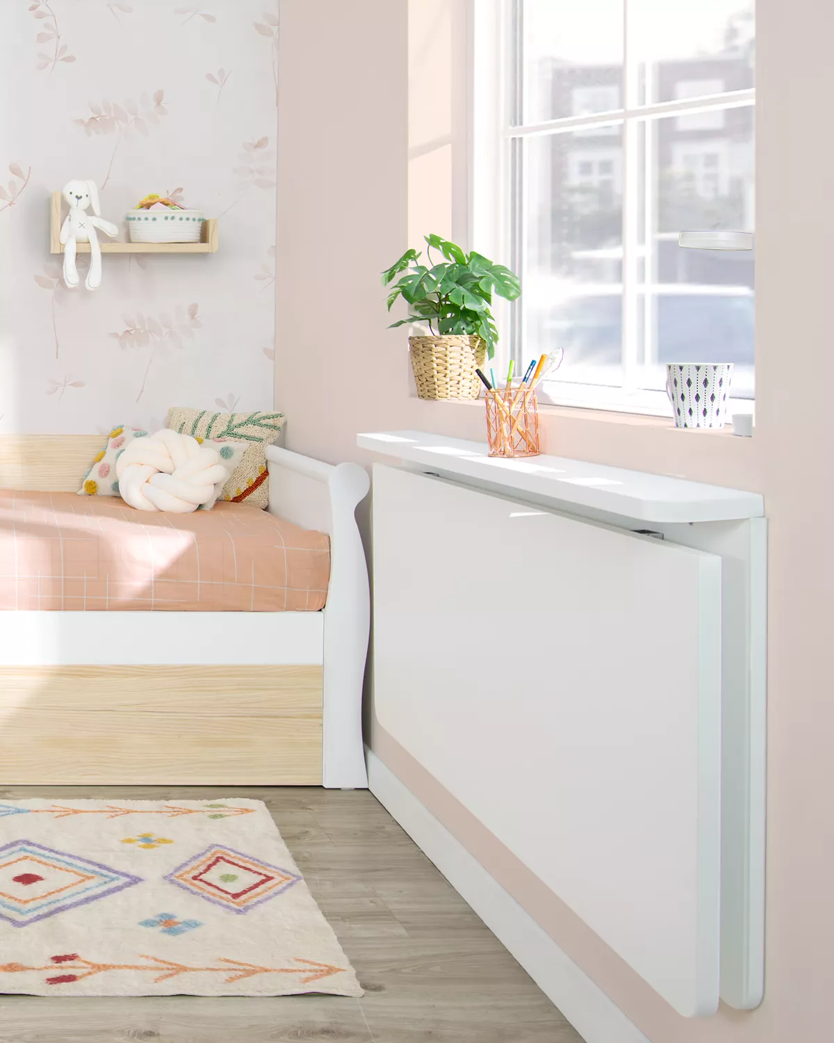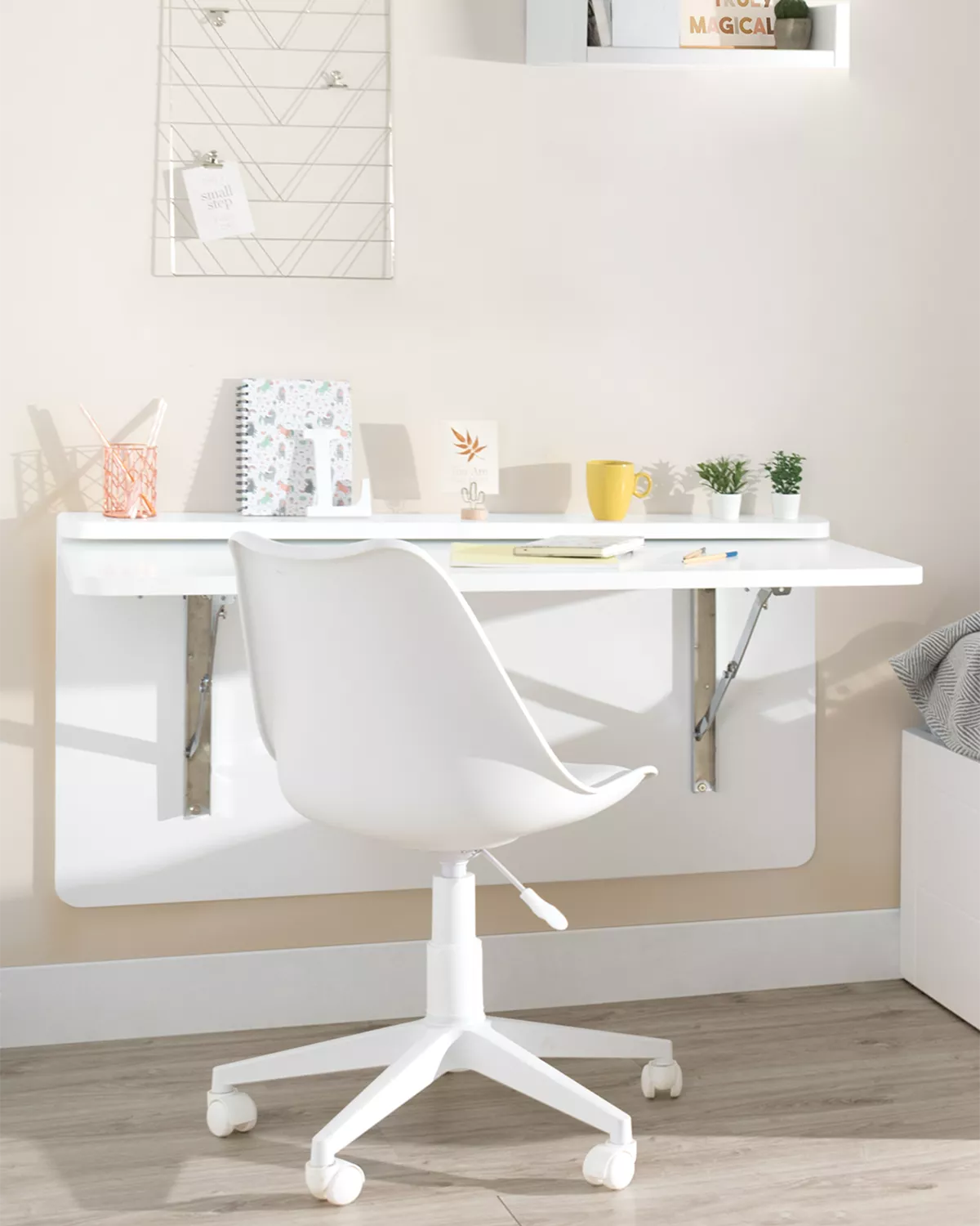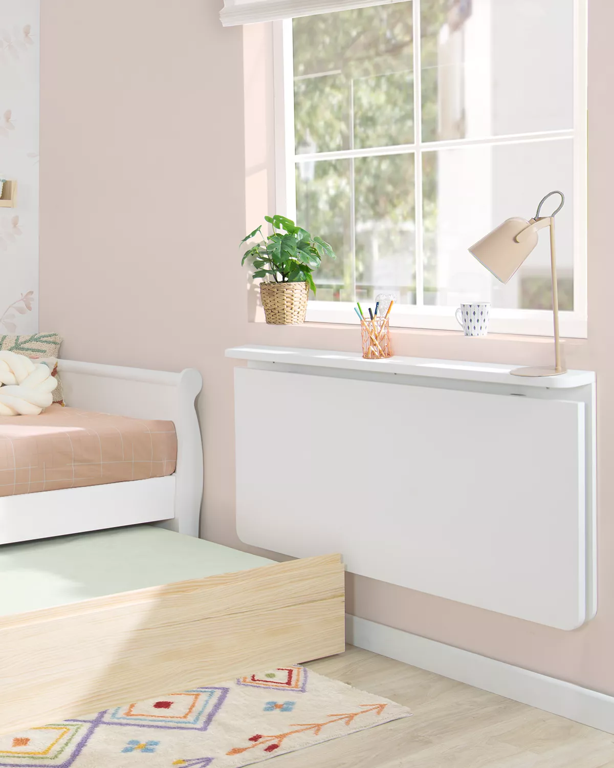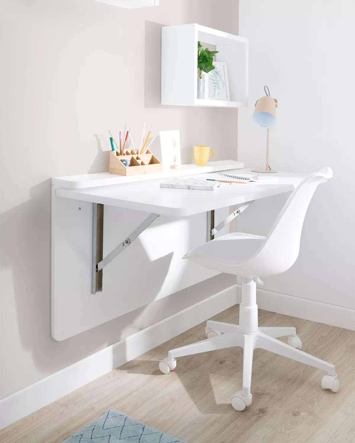 A nossa secretária de parede dobrável funciona como um espaço de trabalho versátil e prático, permitindo que o seu filho estude, desenhe ou se dedique às suas actividades favoritas sem comprometer o valioso espaço do quarto. Com o seu design compacto, esta secretária dobra-se convenientemente contra a parede quando não está a ser utilizada, libertando espaço para brincar e movimentar-se.