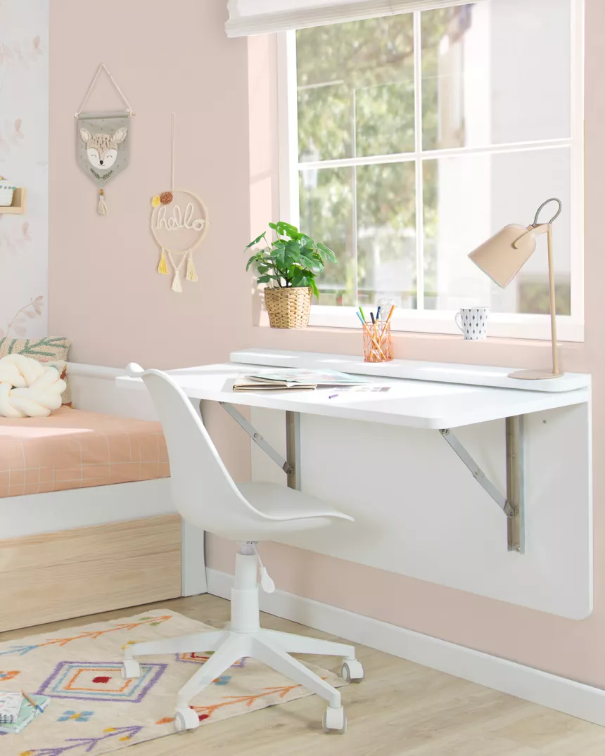 Secretária lacada a branco: Graças ao seu acabamento em laca branca, esta secretária não só tem um aspeto moderno e limpo, como também ajuda as crianças a manterem-se concentradas na sua área de estudo.