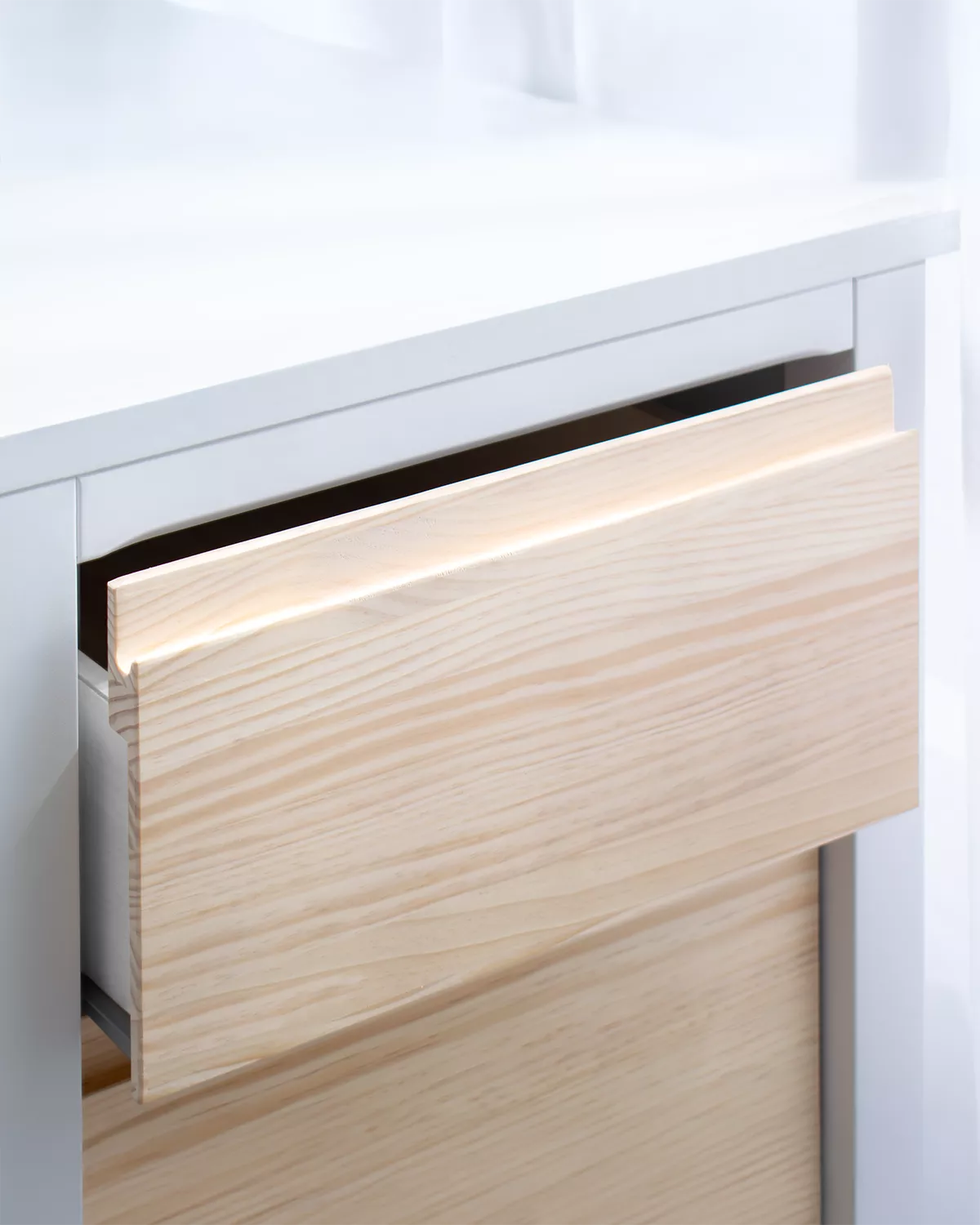 Acabamento em madeira de PINHO natural: Frente das gavetas inferiores em madeira natural, tratada com produtos naturais. Além disso, proporciona proteção à madeira para o uso diário.