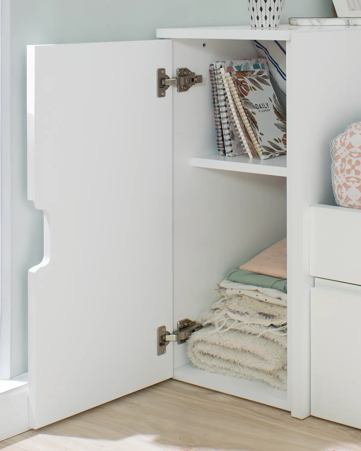 O acabamento lacado a branco acrescenta elegância e permite que o baú se adapte a qualquer estilo decorativo, seja moderno, nórdico ou minimalista.